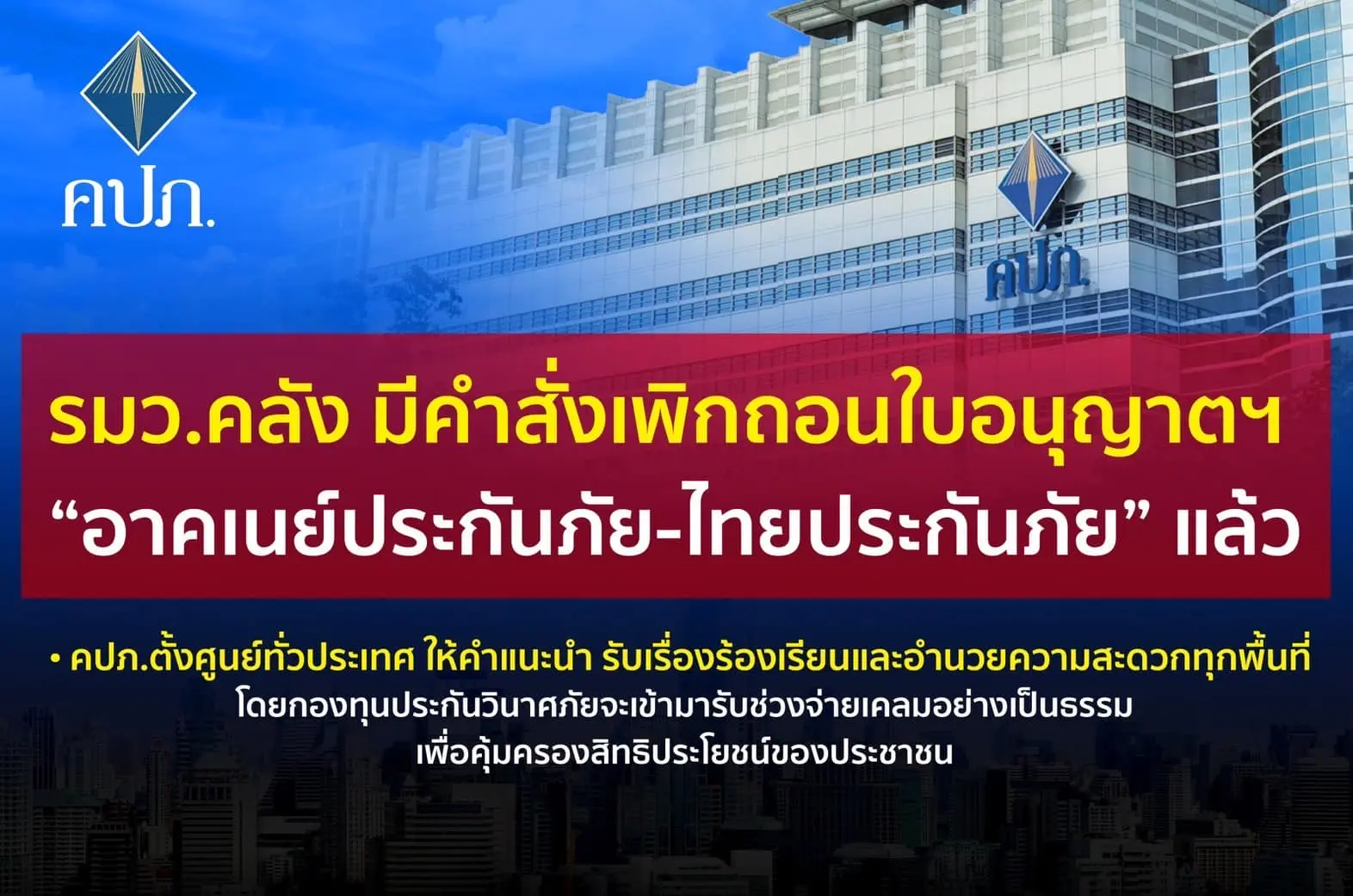 รมว.คลัง มีคำสั่งเพิกถอนใบอนุญาตฯ อาคเนย์ประกันภัย – ไทยประกันภัย โดย คปภ.ตั้งศูนย์ทั่วประเทศให้คำแนะนำ รับเรื่องร้องเรียน และอำนวยความสะดวก