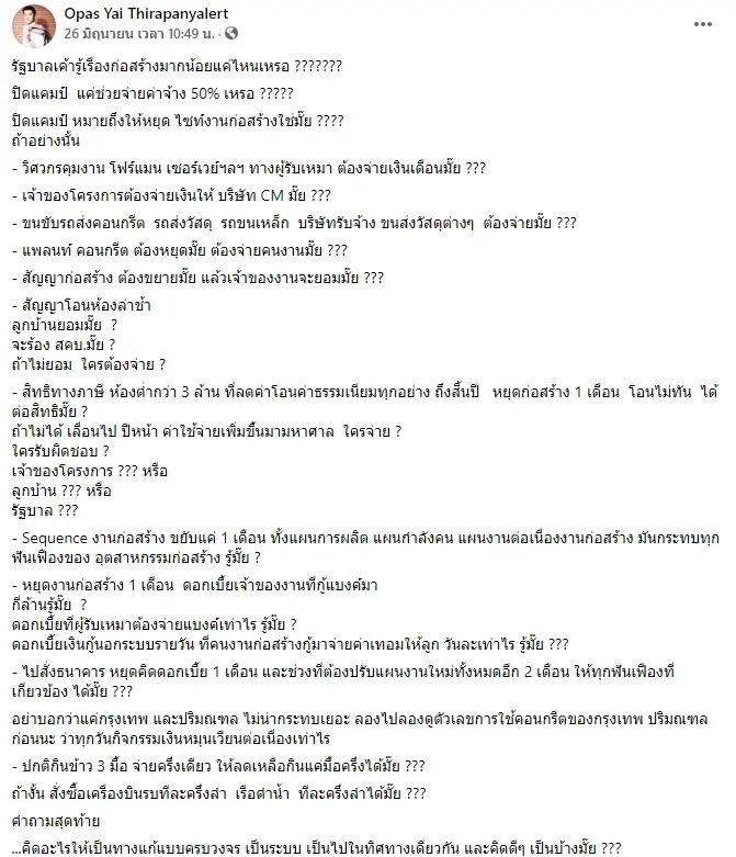 นักลงทุนอสังหาฯ โพสต์เฟซบุ๊ก รัวคำถามถึงรัฐบาล ปิดไซต์ก่อสร้างรู้อะไรบ้าง หลังถูกสั่งให้ปิด 1 เดือน ความเสียหายเท่าไหร่รู้ไหม
