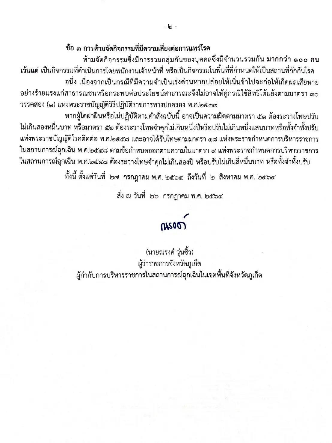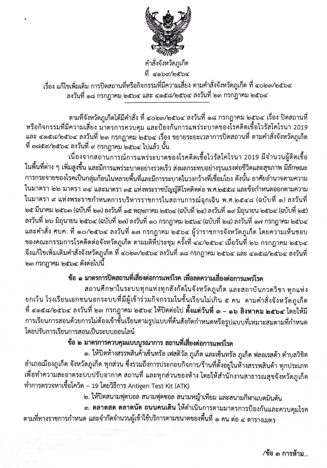 เมื่อวันที่ 26 กรกฎาคม ที่ผ่านมา คณะกรรมการโรคติดต่อจังหวัดภูเก็ต ได้มีมติจากที่ประชุม ให้แก้ไขเพิ่มเติมการปิดสถานที่ หรือกิจกรรมที่มีความเสี่ยงตามคำสั่งจังหวัดภูเก็ต โดยนายณรงค์ วุ่นซิ้ว ผู้ว่าราชการจังหวัดภูเก็ต ได้ลงนามคำสั่งจังหวัดภูเก็ต มีเนื้อหา ดังนี้