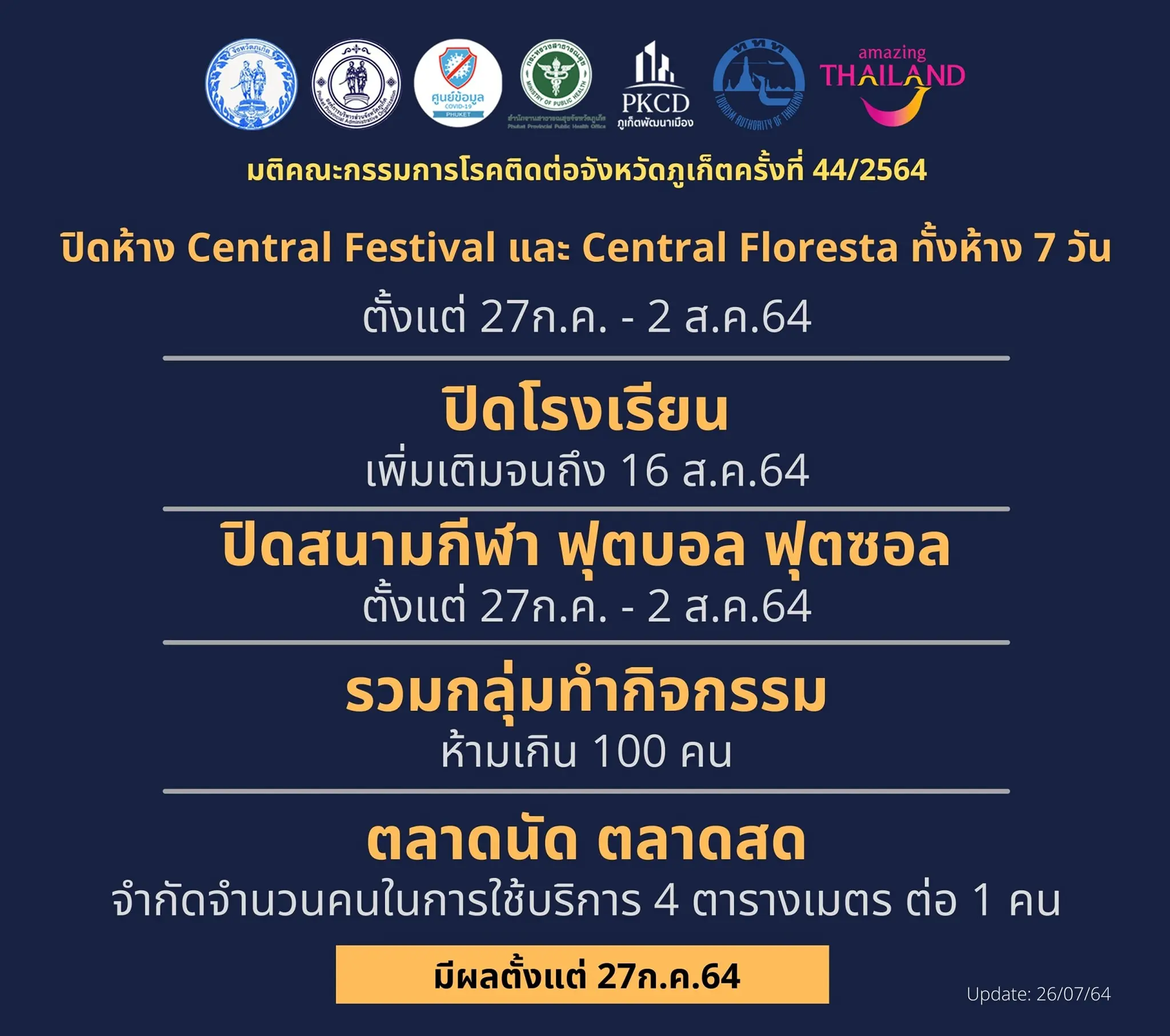 ผู้ว่าฯภูเก็ตสั่งเพิ่มมาตรการ ปิดห้างเซ็นทรัล 7 วัน ทำความสะอาดระบบปรับอากาศ ทุกส่วนของห้าง เพื่อลดความเสี่ยงแพร่โรค พร้อมเลื่อนเปิดเทอมถึง 16 ส.ค.