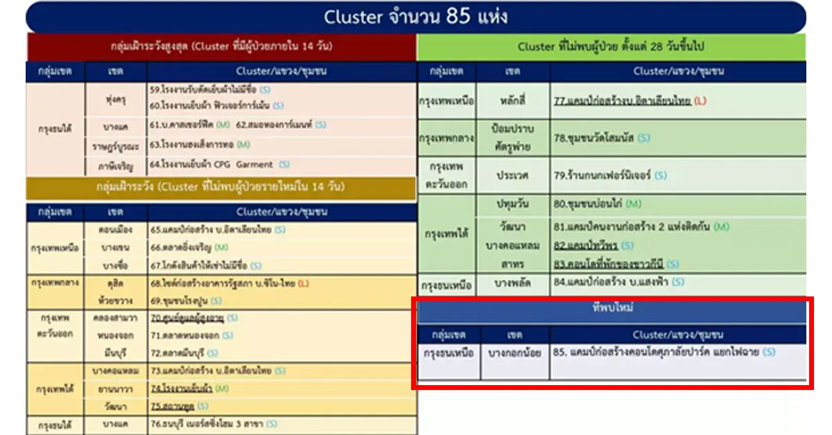 โผลอีก 1 แห่งพบ คลัสเตอร์ใหม่ กทม. แคมป์ก่อสร้างแยกไฟฉาย ติดเชื้อกว่า 96 ราย จากการตรวจเชื้อทั้งหมด 363 ราย ทำให้กทม.มีคลัสเตอร์รวม 85 ราย