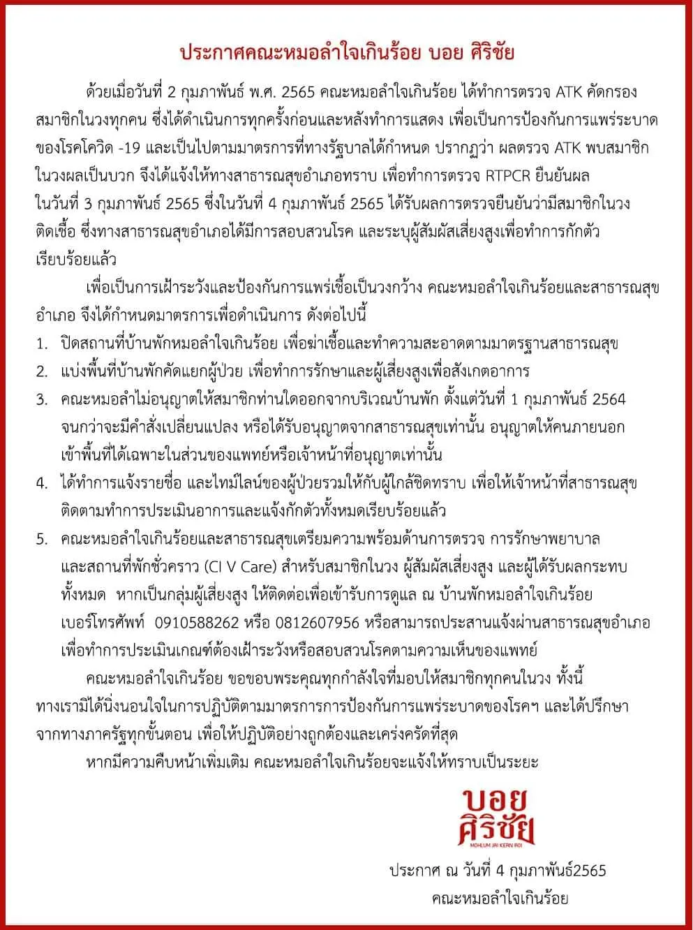 ขณะที่เฟซบุ๊ก คณะหมอลำใจเกินร้อย โพสต์ประกาศจากคณะหมอลำใจเกินร้อย บอย ศิริชัย ระบุว่า
