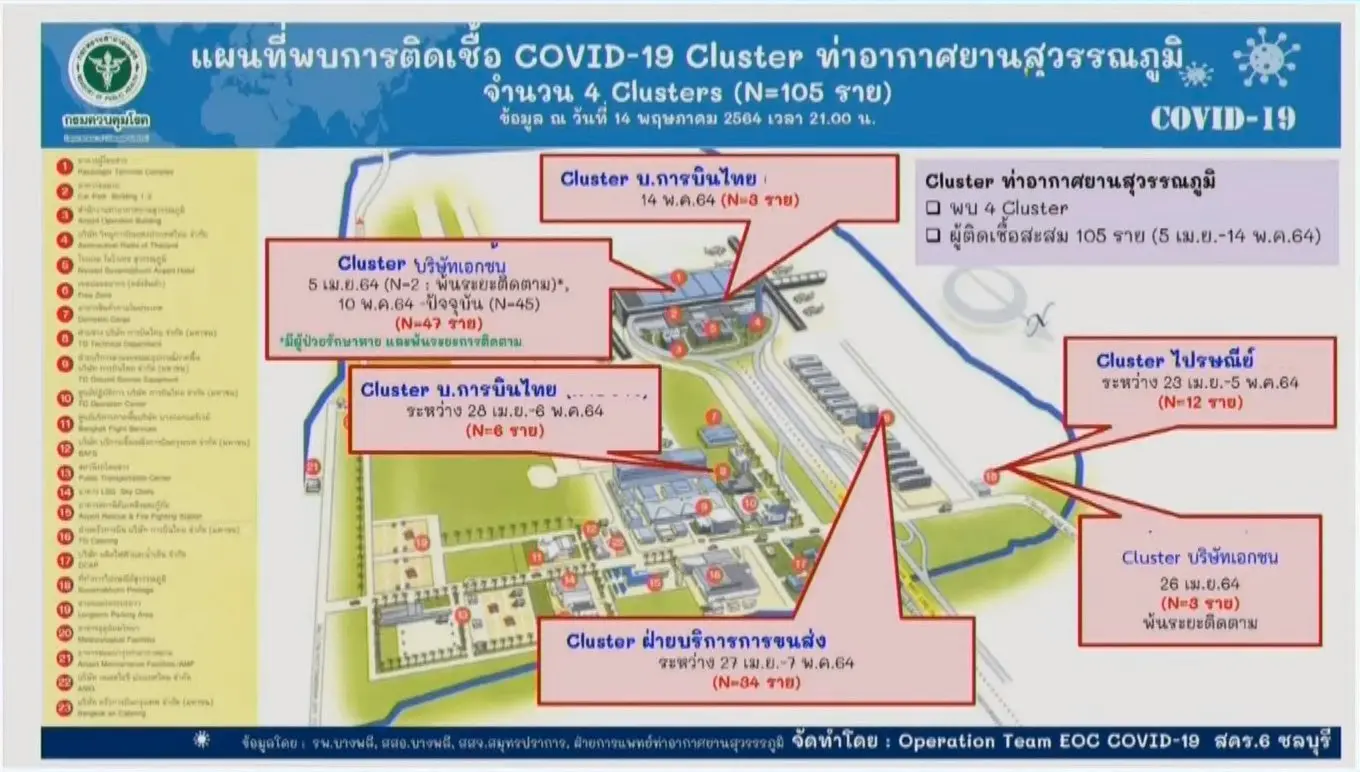 วันนี้ 15 พฤษภาคม นพ.ทวีศิลป์ วิษณุโยธิน โฆษกศูนย์บริหารสถานการณ์โควิด-19 (ศบค.) เปิดเผยว่า พบการติดเชื้อโควิด-19 ของบริษัทเอกชนในคลัสเตอร์ของพื้นที่ท่าอากาศยานสุวรรณภูมิ โดยมีผู้ติดเชื้อรวมสะสมจำนวน 105 ราย (5 เม.ย.-14 พ.ค.) แบ่งเป็น