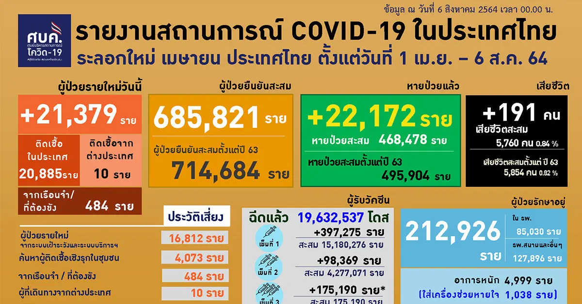 รายงานสถานการณ์การแพร่ระบาดเชื้อโควิด-19 ในวันที่ 6 สิงหาคม 2564 ทุบสถิติอีกครั้ง พบผู้ติดเชื้อรายใหม่พุ่งสูงถึง 21.378 ราย ซึ่งแบ่งออกเป็นสองกลุ่มคือ ผู้ติดเชื้อรายใหม่ 20,895 ราย และผู้ติดเชื้อในเรือนจำ 484 ราย หากนับรวมยอดผู้ติดเชื้อตั้งแต่ช่วงเดือนเมษายนที่ผ่านมานั้น จำนวนผู้ป่วยสะสม 685,821 ราย ในส่วนของผู้เสียชีวิตวันนี้ 191 ราย หากนับรวมยอดผู้เสียชีวิตตั้งแต่ช่วงเดือนเมษายนที่ผ่านมานั้น เป็นจำนวน 5,854 ราย