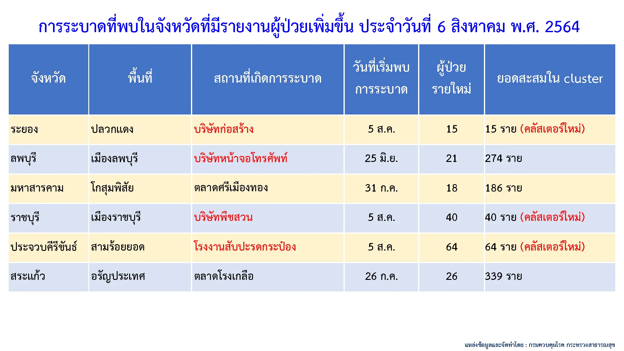 ในส่วนของคลัสเตอร์โควิดแห่งใหม่ วันนี้มีรายงานการตรวพบครัวเตอร์ใหม่อีก 5 แห่งใน 5 จังหวัด และยังคงเป็นกลุ่มการแพร่ระบาดในบริษัท และโรงงาน ที่เป็นกลุ่มคนรวมกันจำนวนมาก ซึ่งรวมจำนวนผู้ติดเชื้อทั้งหมด 152 ราย โดยคลัสเตอร๋ใหม่วันนี้ มีดังนี้
