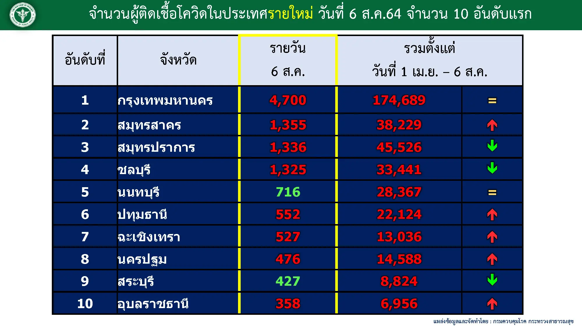 และเป็นเช่นเดิมเหมือนหลายเดือนที่ผ่านมา กรุงเทพมหานครยังคงเป็นพื้นที่ที่พบผู้ติดเชื้อมากที่สุดในประเทศ โดยวันนี้ยอดผู้ติดเชื้อนำโด่งเฉียดห้าพันราย จำยงย 4700 ราย ตามมาด้วย สมุทรสาคร 1,355 ราย ซี่งยังคงเพิ่มขึ้น สมุทรปราการ 1,336 ราย ชลบุรี 1,325 ราย นนทบุรี 716 ราย ปทุมธานี 552 ราย ฉะเชิงเทรา 527 ราย นครปฐม 476 ราย สระบุรี 427 ราย และอุบลราชธานี 358 ราย