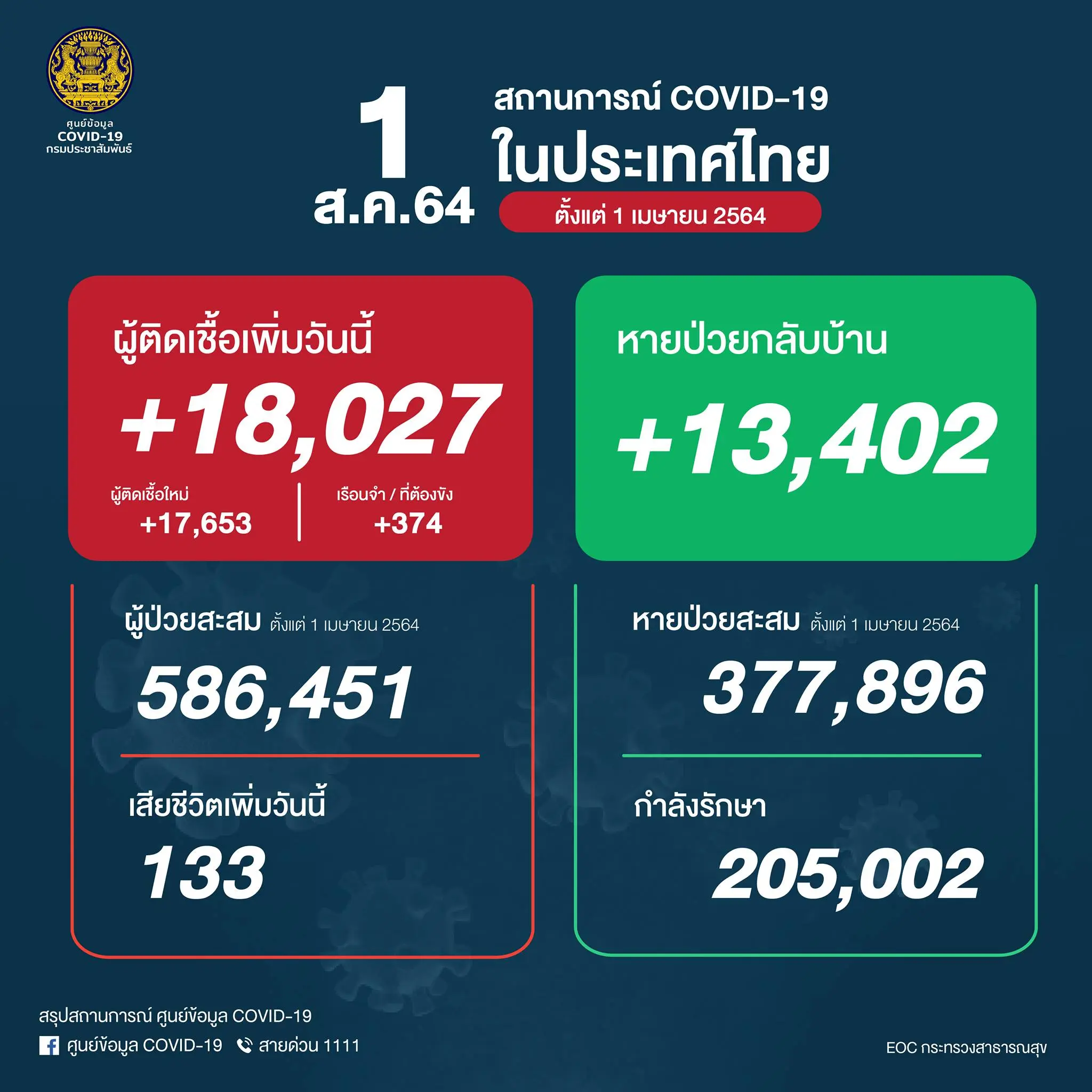 โควิดวันนี้ — เมื่อวันที่ 1 สิงหาคม 2564 ศูนย์ข้อมูล COVID-19 รายงานยอดผู้ติดเชื้อ โควิด-19 โดยพบผู้ติดเชื้อรายใหม่เพิ่ม 17,653 ราย เสียชีวิต 133 ราย ทำให้การระบาดโควิด19 ระลอกใหม่ตั้งแต่เดือนเมษายน 2564 มียอดผู้เสียชีวิตรวม 4,896 ราย และยอดผู้เสียชีวิตสะสมจากการแพร่ระบาดของโควิด19 ตั้งแต่ปี 63 มีทั้งหมด 4,990 ราย สำหรับวันนี้มีรายงานผู้ติดเชื้อจากเรือนจำทั้งหมด 261 ราย รวมจำนวนผู้ติดเชื้อรายใหม่วันนี้ทั้งสิ้น 18,027 ราย