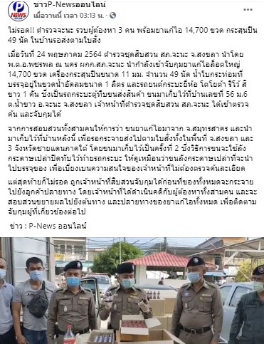 ตำรวจรวบ 3 หนุ่ม พร้อมยาแก้ไอ 14,700 ขวด กระสุนปืน 49 นัด ในบ้านรอส่งตามใบสั่งเมื่อวันที่ 24 พฤษภาคม 2564 ตำรวจชุดสืบสวน สภ.จะนะ จ.สงขลา นำโดย พ.ต.อ.พชรพล ณ นคร ผกก.สภ.จะนะ นำกำลังเข้าจับกุมยาแก้ไอล็อตใหญ่ 14,700 ขวด เครื่องกระสุนปืนขนาด 11 มม. จำนวน 49 นัด น้ำใบกระท่อมที่บรรจุอยู่ในขวดน้ำอัดลมขนาด 1 ลิตร และรถยนต์กระบะยี่ห้อ โตโยต้า รีโว้ สีขาว 1 คัน ซึ่งเป็นรถกระบะตู้ทึบขนส่งสินค้า