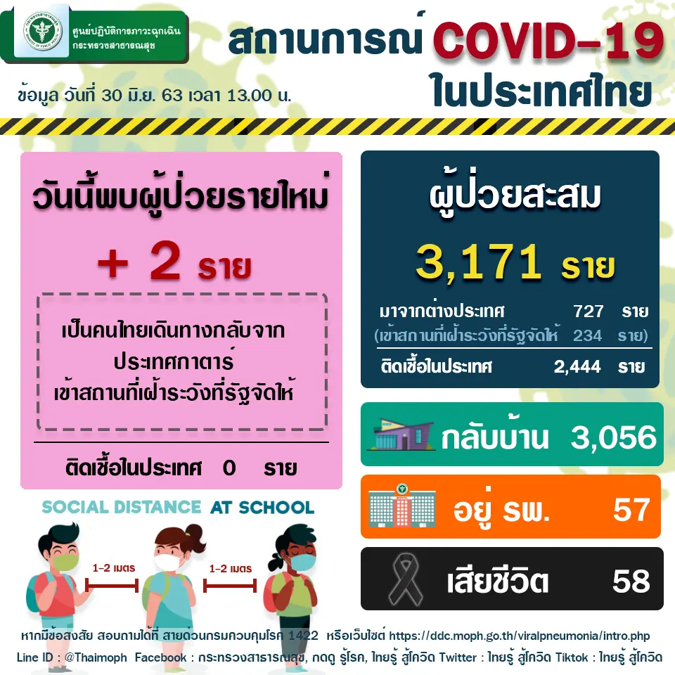 วันนี้ (30 มิถุนายน 2563) ที่ศูนย์ปฏิบัติการฉุกเฉินด้านการแพทย์และสาธารณสุข หมอบุ๋ม แพทย์หญิงพรรณประภา ยงค์ตระกูล ผู้ช่วยโฆษกศูนย์บริหารสถานการณ์โควิด 19 แถลงความคืบหน้าสถานการณ์ผู้ติดเชื้อไวรัสโคโรนา 2019 ในประเทศไทยวันนี้ มีผู้ติดเชื้อรายใหม่ 2 ราย เป็นผู้ที่เดินทางกลับจากประเทศกาตาร์และเข้ารับการเฝ้าระวังกักตัวในสถานที่รัฐจัดให้ มีผู้ป่วยกลับบ้านได้ 3 ราย ยอดผู้ป่วยกลับบ้านสะสม 3,056 ราย หรือคิดเป็นร้อยละ 96.37 ของผู้ป่วยทั้งหมด มีผู้ป่วยที่ยังรักษาอยู่ในโรงพยาบาล 57 ราย หรือร้อยละ 1.8 ของผู้ป่วยทั้งหมด ไม่มีผู้เสียชีวิตเพิ่ม รวมผู้เสียชีวิตสะสม 58 ราย ผู้ป่วยสะสมทั้งสิ้น 3,171 ราย