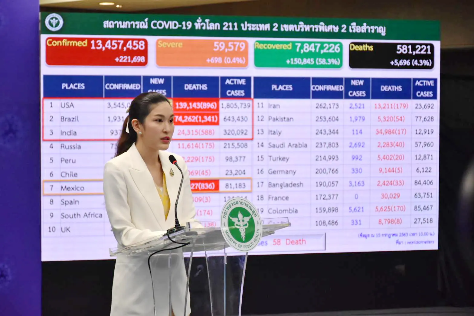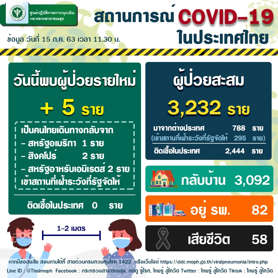 วานนี้ (15 กค. 63 )ที่ศูนย์ปฏิบัติการฉุกเฉินด้านการแพทย์และสาธารณสุข หมอบุ๋ม แพทย์หญิงพรรณประภา ยงค์ตระกูล ผู้ช่วยโฆษกศูนย์บริหารสถานการณ์โควิด 19 แถลงความคืบหน้าสถานการณ์ผู้ติดเชื้อไวรัสโคโรนา 2019 ในประเทศไทยวันนี้ มีผู้ติดเชื้อรายใหม่ 5 ราย เป็นผู้ที่เดินทางกลับ