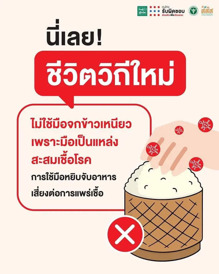 ล่าสุด สำนักงานกองทุนสนับสนุนการสร้างเสริมสุขภาพ หรือ สสส. ได้เผยแพร่์พร้อมพร้อมข้อความว่า ชีวิตวิถีใหม่ ไม่ใช้มือจกข้าวเหนียว เพราะเป็นแหล่งสะสมของเชื้อโรค การใช้มือหยิบจับอาหาร เสี่ยงต่อการแพร่เชื้อ โควิด19 ด้วยความปรารถนาดี
