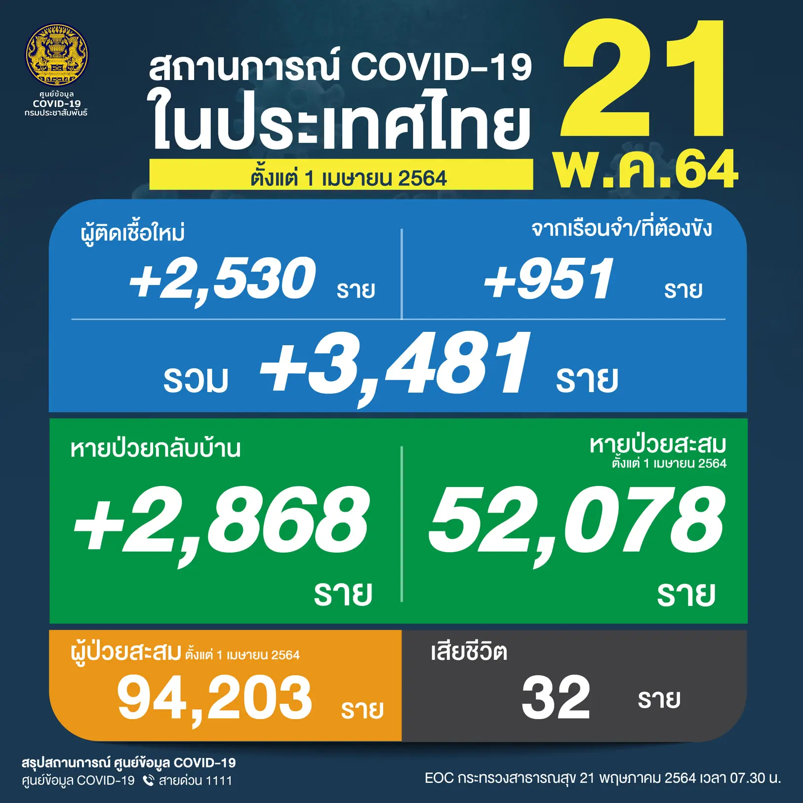 โควิดวันนี้ — เมื่อวันที่ 21 พฤษภาคม 2564 ศูนย์ข้อมูล COVID-19 รายงานยอดผู้ติดเชื้อ โควิด-19 โดยพบผู้ติดเชื้อรายใหม่เพิ่ม 2,530 ราย เสียชีวิต 32 ราย ทำให้การระบาดโควิด19 ระลอกใหม่ตั้งแต่เดือนเมษายน 2564 มียอดผู้เสียชีวิตสะสม 641 ราย ส่วนยอดผู้เสียชีวิตสะสมจากการแพร่ระบาดของโควิด19 ในเวลามีทั้งหมด 735 ราย สำหรับวันนี้มีรายงานผู้ติดเชื้อจากเรือนจำทั้งหมด 951 ราย รวมจำนวนผู้ติดเชื้อรายใหม่วันนี้ทั้งสิ้น 3,481 ราย