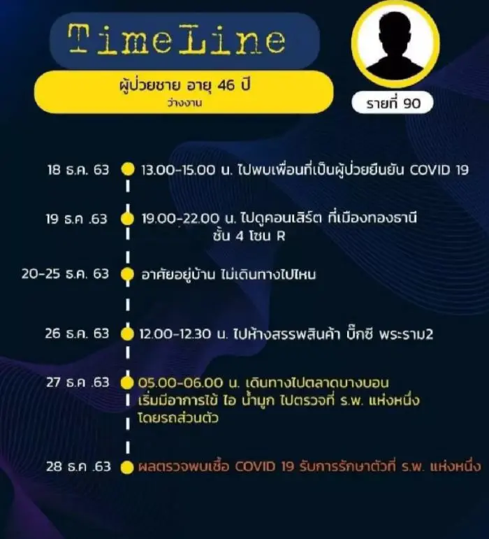 โดยมีผู้ป่วย 1 ราย เป็นชายมีประวัติที่น่าเป็นห่วง โดยไปในสถานที่ที่มีคนจำนวนมาก อย่างคอนเสิร์ต อัสนี วสันต์ ที่เมืองทองธานี ในวันที่ 19 ธ.ค. เวลา 19.00น.- 22.00 น.