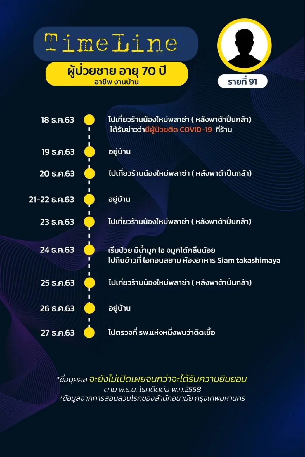 ขณะที่ผู้ป่วยชายอีกราย อายุ 70 ปี เดินทางไปเที่ยวร้านน้องใหม่พลาซ่า บริเวณหลังเซ็นทรัลปิ่นเกล้า ถึง 3 ครั้ง ตั้งแต่ 18 ธ.ค. ถึง 25 ธ.ค.