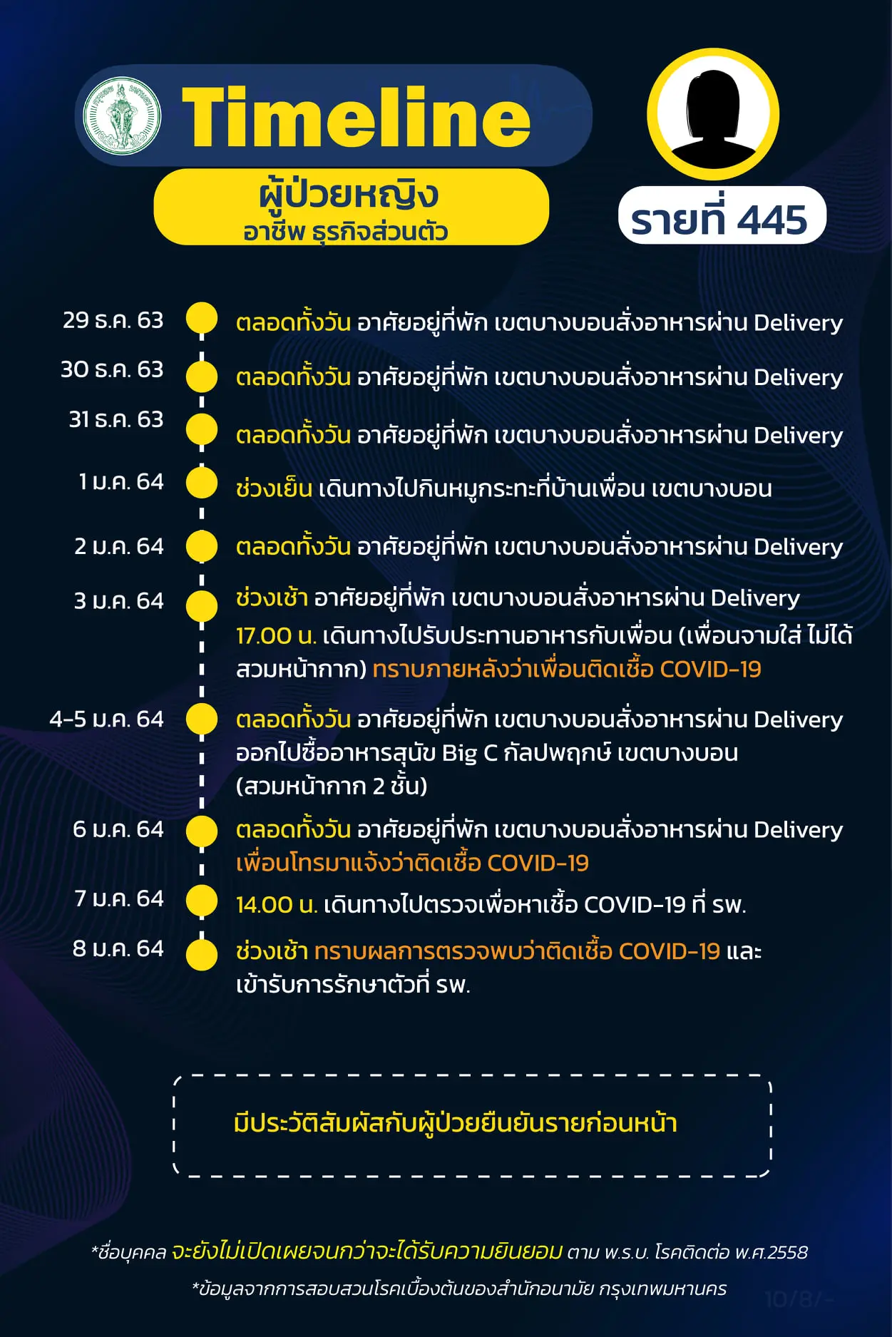 โควิด19 — จากกรณีไทม์ไลน์ผู้ติดเชื้อโควิด รายที่ 445 เป็นหญิงชาวกรุงเทพ ประกอบอาชีพธุรกิจส่วนตัว ตามข้อมูลจากเฟซบุ๊ก เอิร์ธ พงศกร ขวัญเมือง – Earth Pongsakorn Kwanmuang ที่โพสต์สรุป กทม. พบผู้ติดเชื้อใน ตั้งแต่วันที่ 20 ธ.ค. 63 – 17 ม.ค. 64 รวม 575 ราย