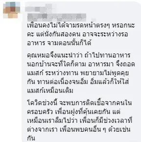 คุณหมอจึงแนะนำว่า ถ้าไปทานอาหารนอกบ้านจะที่ใดก็ตาม อาหารมา จึงถอดแมสก์ ระหว่างทาน พยายามไม่พูดคุยกัน ทานต่อเนื่องจนอิ่ม อิ่มแล้วก็ให้ใส่แมสก์เหมือนเดิม