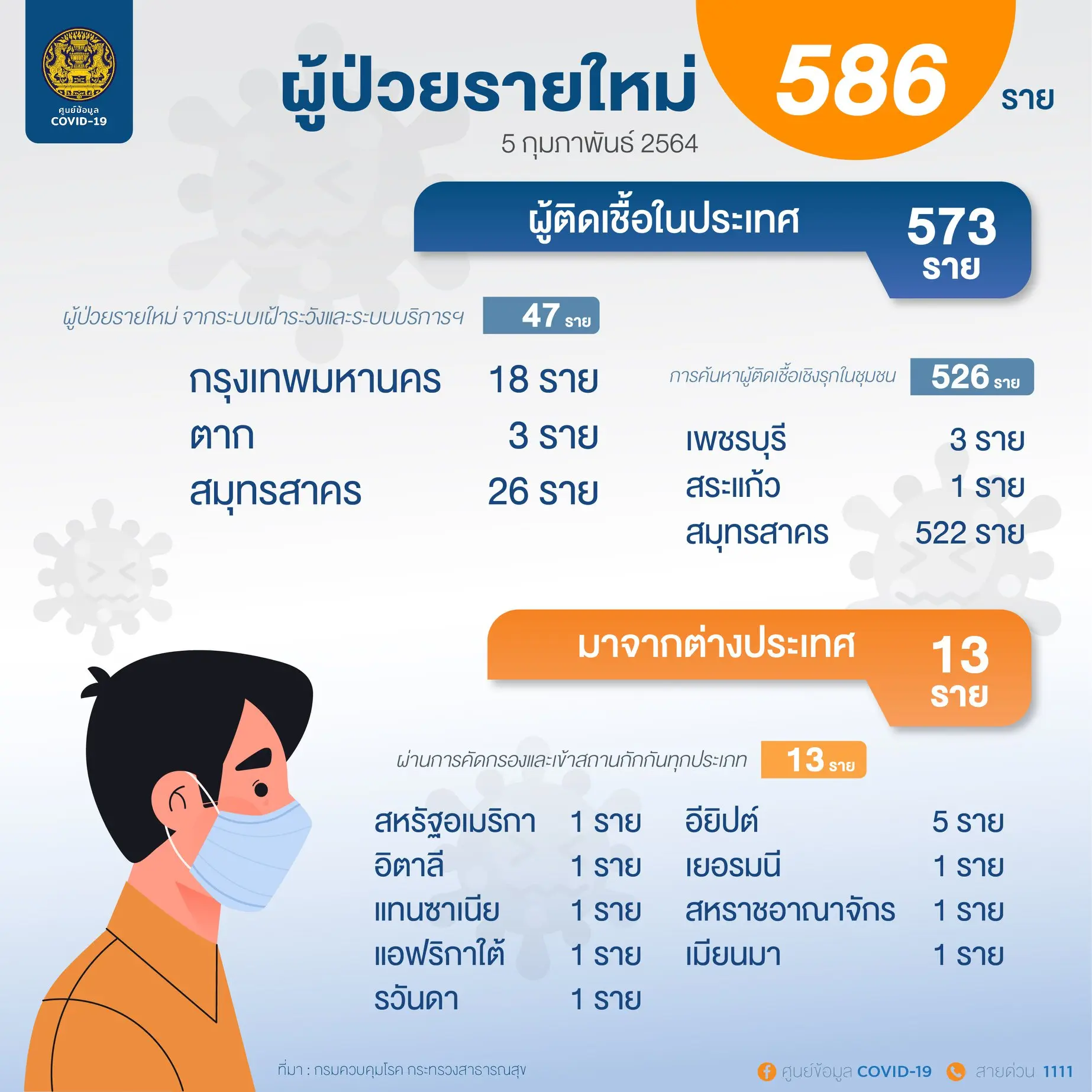พบผู้ป่วยรายใหม่ 586 ราย เป็นการติดเชื้อในประเทศ 573 ราย ซึ่งมาจากระบบเฝ้าระวังและระบบบริการ 47 ราย และการค้นหาเชิงรุกในชุมชน 526 ราย และผู้เดินทางจากต่างประเทศและเข้าสถานที่กักกันที่รัฐจัดให้ 13 ราย