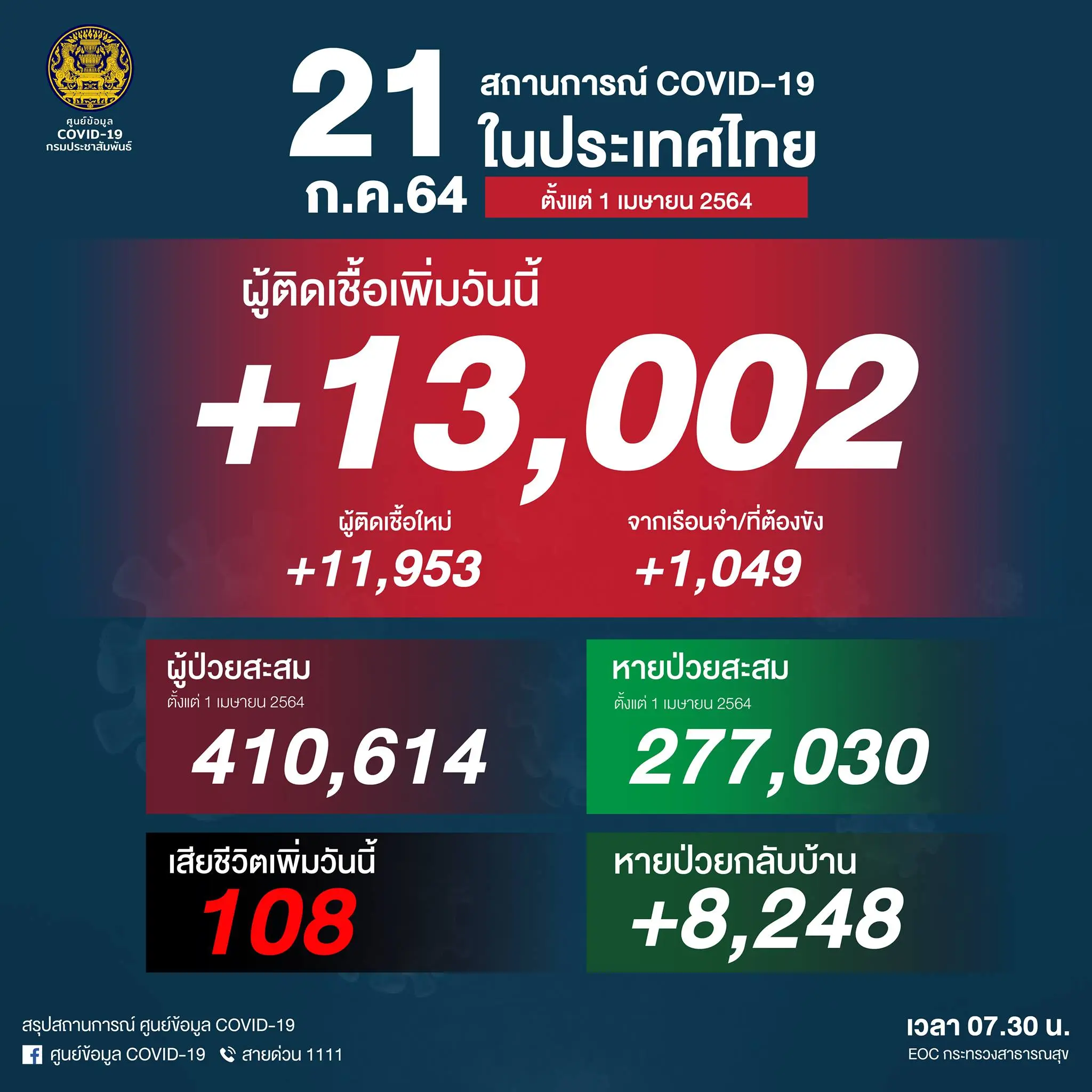 โควิดวันนี้ — เมื่อวันที่ 21 กรกฏาคม 2564 ศูนย์ข้อมูล COVID-19 รายงานยอดผู้ติดเชื้อ โควิด-19 โดยพบผู้ติดเชื้อรายใหม่เพิ่ม 11,953 ราย เสียชีวิต 108 ราย ทำให้การระบาดโควิด19 ระลอกใหม่ตั้งแต่เดือนเมษายน 2564 มียอดผู้เสียชีวิตรวม 3,516 ราย และยอดผู้เสียชีวิตสะสมจากการแพร่ระบาดของโควิด19 ตั้งแต่ปี 63 มีทั้งหมด 3,610 ราย สำหรับวันนี้มีรายงานผู้ติดเชื้อจากเรือนจำทั้งหมด 1,049 ราย รวมจำนวนผู้ติดเชื้อรายใหม่วันนี้ทั้งสิ้น 13,002 ราย