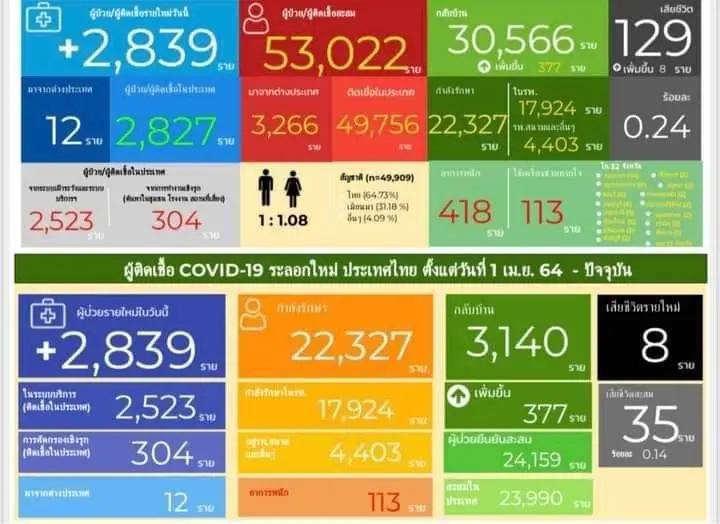 โควิดวันนี้ —- เมื่อวันที่ 24 เม.ย. 64 ผู้สื่อข่าวรายงานว่า วันนี้ประเทศไทย พบจํานวนผู้ติดเชื้อโควิด-19 เพิ่มขึ้น 2,839 ราย ในจำนวนนี้เป็นผู้ติดเชื้อรายใหม่จากระบบเฝ้าระวังและระบบบริการ 2,523 ราย มาจากการค้นหาเชิงรุกในชุมชน 304 ราย และเป็นผู้ที่เดินทางมาจากต่างประเทศ 12 ราย ส่วนผู้ป่วยสะสมในเวลานี้มี 53,022 ราย