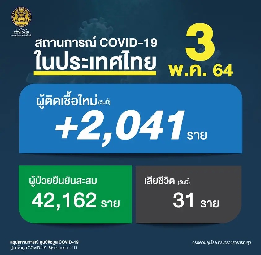 โควิดวันนี้ — วันที่ 3 พ.ค. 2564 กรมควบคุมโรค กระทรวงสาธารณสุข รายงานสถานการณ์การระบาดของไวรัสโคโรนา 2019 ในเวลานี้ยังน่าเป็นห่วง