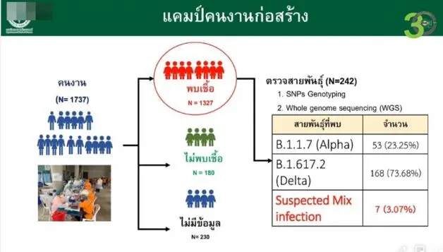 กทม. พบผู้ติดเชื้อ โควิดสายพันธุ์ผสม ‘เดลตา-อัลฟา‘ 7 ราย ในแคมป์งานก่อสร้าง โดยทั้ง 7 รายยังสบายดี และยังไม่มีอาการรุนแรง