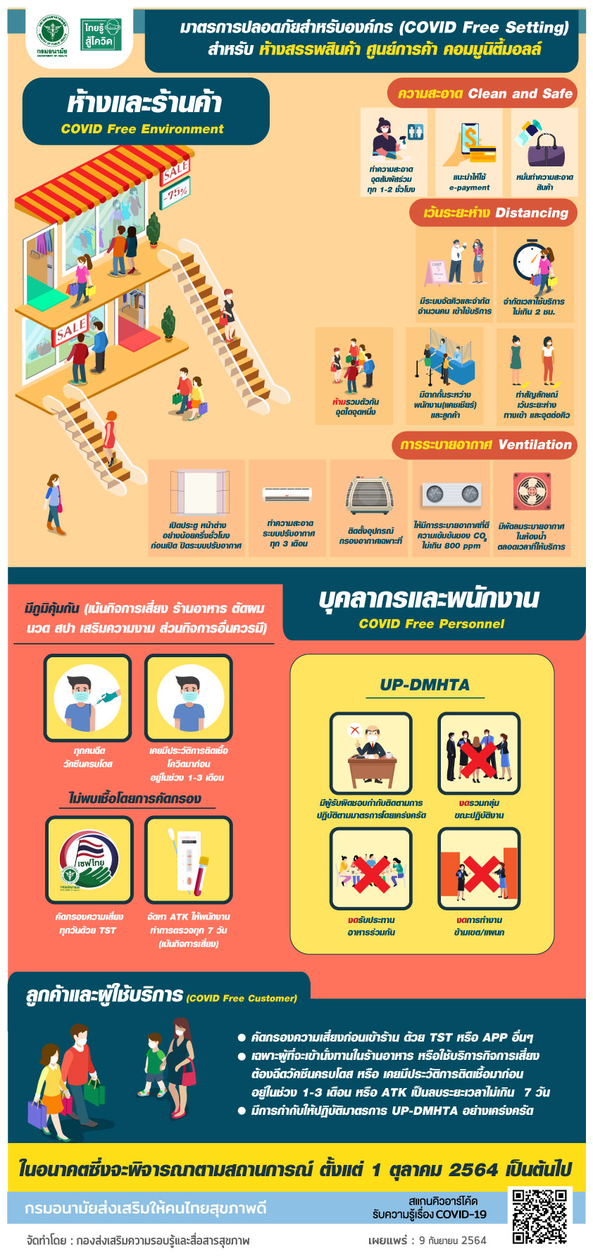 นายแพทย์สุวรรณชัย วัฒนายิ่งเจริญชัย อธิบดีกรมอนามัย กล่าวว่า จากการออกข้อกำหนด “ห้างสรรพสินค้า ศูนย์การค้า คอมมูนิตี้มอลล์” ออกความในมาตรา 9 แห่งพระราชกำหนด การบริหารราชการในสถานการณ์ฉุกเฉิน พ.ศ. 2548 ฉบับที่ 32 นั้น กำหนดให้ศูนย์การค้า ห้างสรรพสินค้า ในพื้นที่ควบคุมสูงสุดและเข้มงวด (สีแดงเข้ม) เปิดให้บริการได้ แต่เนื่องจากจัดเป็นพื้นที่ที่คนรวมตัวกันค่อนข้างสูง จึงขอความร่วมมือศูนย์การค้า ห้างสรรพสินค้า ที่เปิดดำเนินการต้องเฝ้าระวังความเสี่ยงพร้อมปฎิบัติตามมาตรการป้องกันโควิด-19 อย่างเคร่งครัด ดังนี้