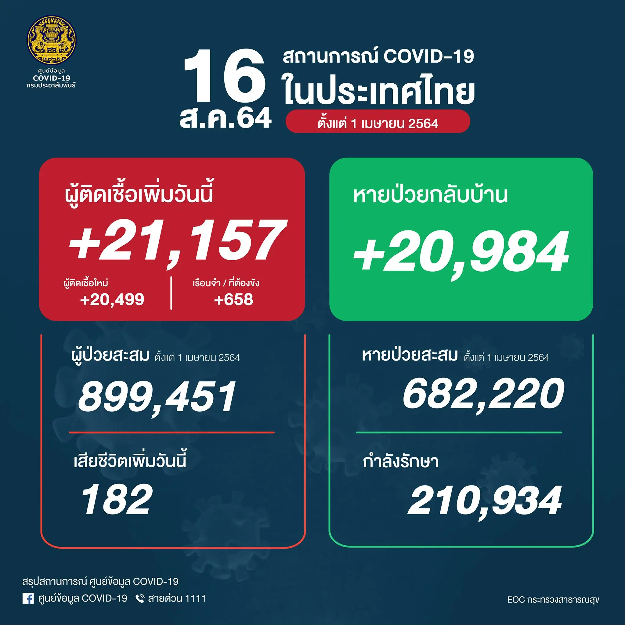 โควิดวันนี้ — เมื่อวันที่ 16 สิงหาคม 2564 ศูนย์ข้อมูล COVID-19 รายงานยอดผู้ติดเชื้อ โควิด-19 โดยพบผู้ติดเชื้อรายใหม่เพิ่ม 20,499 ราย เสียชีวิต 182 ราย ทำให้การระบาดโควิด19 ระลอกใหม่ตั้งแต่เดือนเมษายน 2564 มียอดผู้เสียชีวิตรวม 7,640 ราย และยอดผู้เสียชีวิตสะสมจากการแพร่ระบาดของโควิด19 ตั้งแต่ปี 63 มีทั้งหมด 7,734 ราย สำหรับวันนี้มีรายงานผู้ติดเชื้อจากเรือนจำทั้งหมด 658 ราย รวมจำนวนผู้ติดเชื้อรายใหม่วันนี้ทั้งสิ้น 21,157 ราย