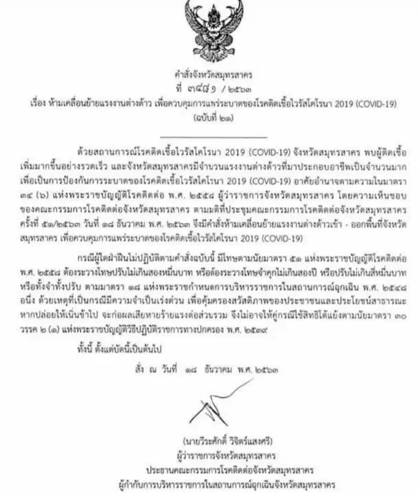 โควิดสมุทรสาคร — นายวีระศักดิ์ วิจิตร์แสงศรี ผู้ว่าราชการจังหวัดสมุทรสาคร ออกคำสั่งฉบับที่ 21 ห้ามเคลื่อนย้ายแรงงานต่างด้าวออกนอกจังหวัด เพื่อควบคุมการแพร่ระบาด โควิด19 ฝ่าฝืนมีโทษทั้งจำคุกและปรับ