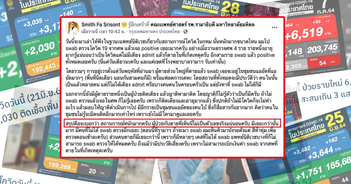 สถานการรณ์การแพร่ระบาดของเชื้อโควิด-19 ในประเทศไทย ยอดผู้ติดเชื้อรายใหม่ และ จำนวนผู้เสียชีวิต ยังคงสูงอยู่ และ เพิ่มขึ้นสูงเรื่อยๆ ทั้งนี้เมื่อวันที่ 6 กรกฎาคม 2564 นพ.สมิทธิ์ ศรีสนธิ์ แพทย์นิติเวช โรงพยาบาลรามาธิบดี มหาวิทยาลัยมหิดล ได้โพสต์ข้อความลงเฟซบุ๊กส่วนตัว Smith Fa Srisont เกี่ยวกับสถานการณ์การแพร่บาดบาดของเชื้อโควิด อีกทั้งเผยว่า ยอดผู้ป่วย และ ผู้เสียชีวิตมีมากกว่านี้แน่นอน ทั้งนี้ส่วนมากผู้เสียชีวิตจะมาจากชุมชนแออัด