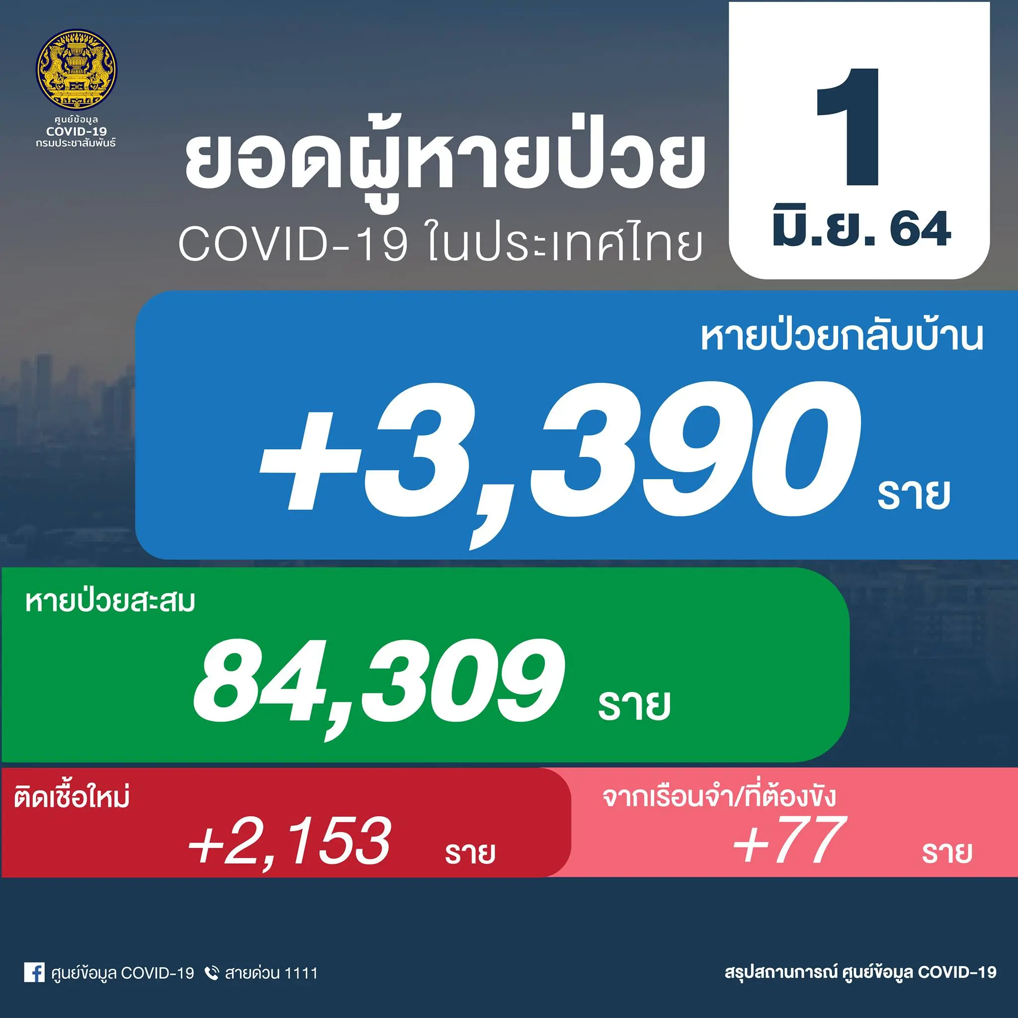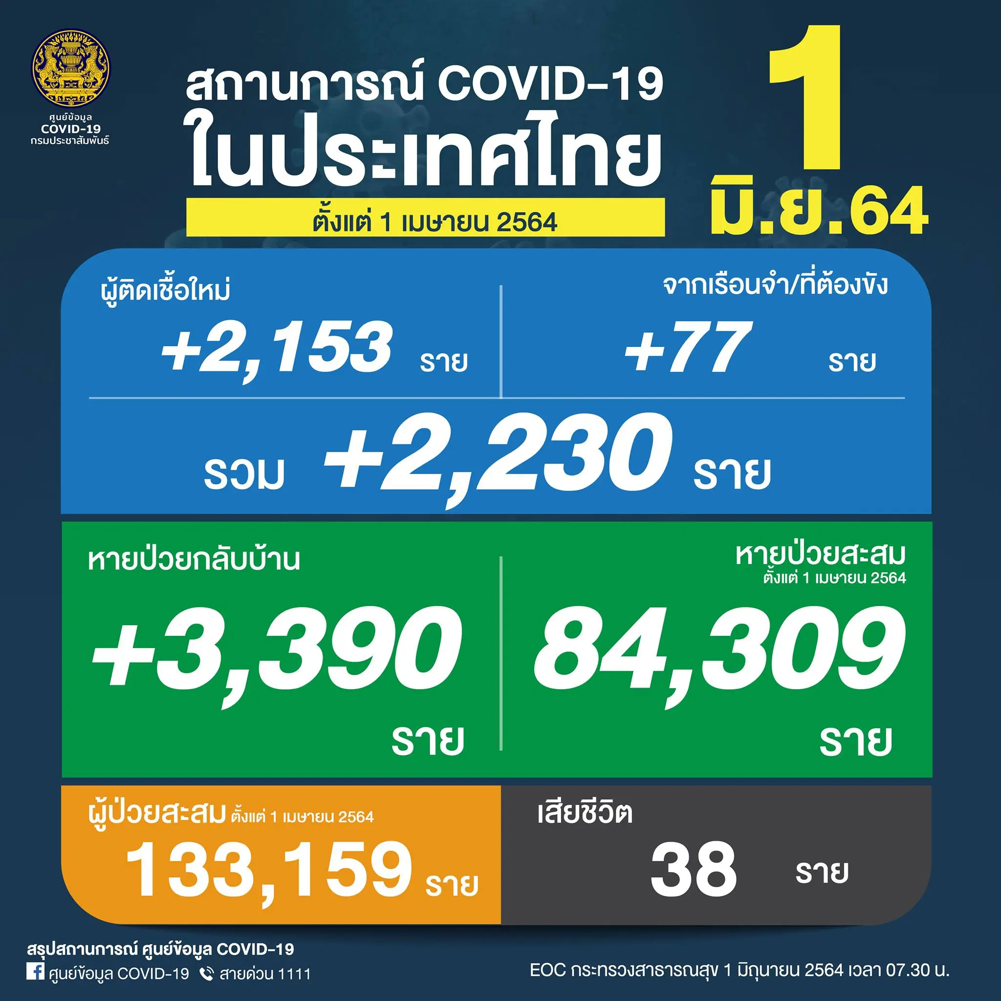 โควิดวันนี้ — เมื่อวันที่ 1 มิถนายน 2564 ศูนย์ข้อมูล COVID-19 รายงานยอดผู้ติดเชื้อ โควิด-19 โดยพบผู้ติดเชื้อรายใหม่เพิ่ม 2,153 ราย เสียชีวิต 38 ราย ทำให้การระบาดโควิด19 ระลอกใหม่ตั้งแต่เดือนเมษายน 2564 มียอดผู้เสียชีวิตสะสม 975 ราย ส่วนยอดผู้เสียชีวิตสะสมจากการแพร่ระบาดของโควิด19 ในเวลามีทั้งหมด 1,069 ราย สำหรับวันนี้มีรายงานผู้ติดเชื้อจากเรือนจำทั้งหมด 77 ราย รวมจำนวนผู้ติดเชื้อรายใหม่วันนี้ทั้งสิ้น 2,230 ราย