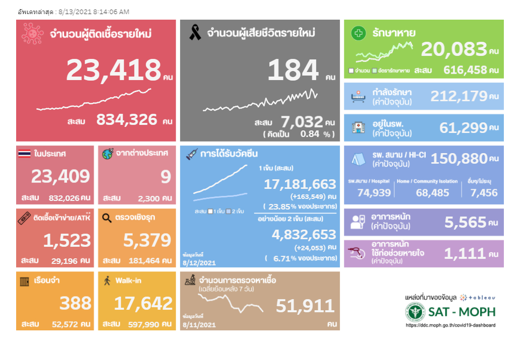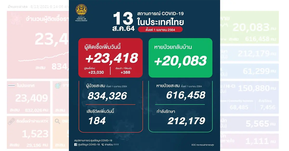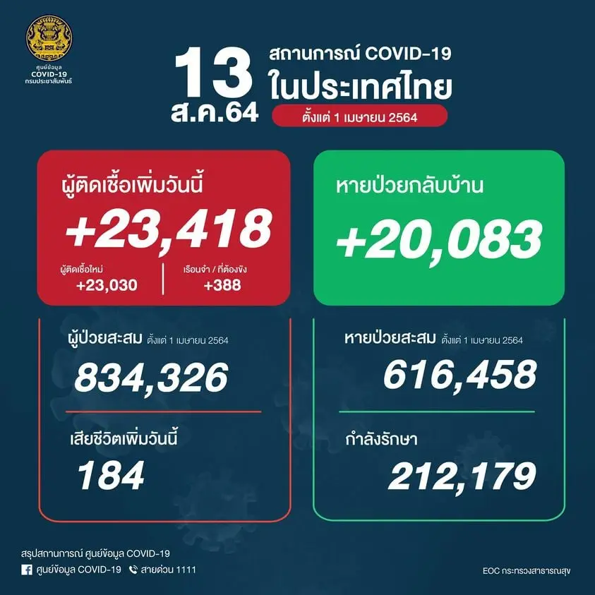 โควิดวันนี้ – รายงานสถานการณ์การแพร่ระบาดของเชื้อโควิด-19 ในวันที่ 13 สิงหาคม 2564 โดยข้อมูลจากเพจเฟซบุ๊ก ศูนย์ข้อมูล COVID-19 และเว็บไซต์ www.ddc.moph.go.th ซึ่งวันนี้ได้ทำลายสถิติสถิติอีกครั้ง พบผู้ติดเชื้อรายใหม่พุ่งสูงถึง 23,418 ราย ซึ่งแบ่งออกเป็นสองกลุ่มคือ ผู้ติดเชื้อรายใหม่ 23,030 ราย และผู้ติดเชื้อในเรือนจำ 388 ราย หากนับรวมยอดผู้ติดเชื้อตั้งแต่ช่วงเดือนเมษายนที่ผ่านมานั้น จำนวนผู้ป่วยสะสม 834,326 ราย ในส่วนของผู้เสียชีวิตวันนี้ 184 ราย หากนับรวมยอดผู้เสียชีวิตตั้งแต่ช่วงเดือนเมษายนที่ผ่านมานั้น เป็นจำนวน 7,032 ราย