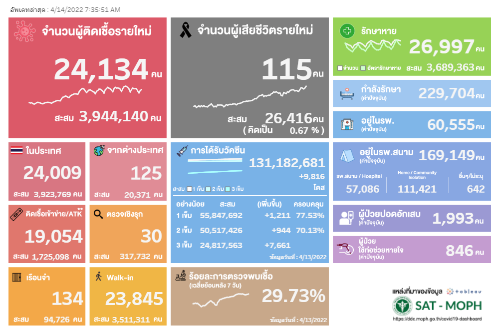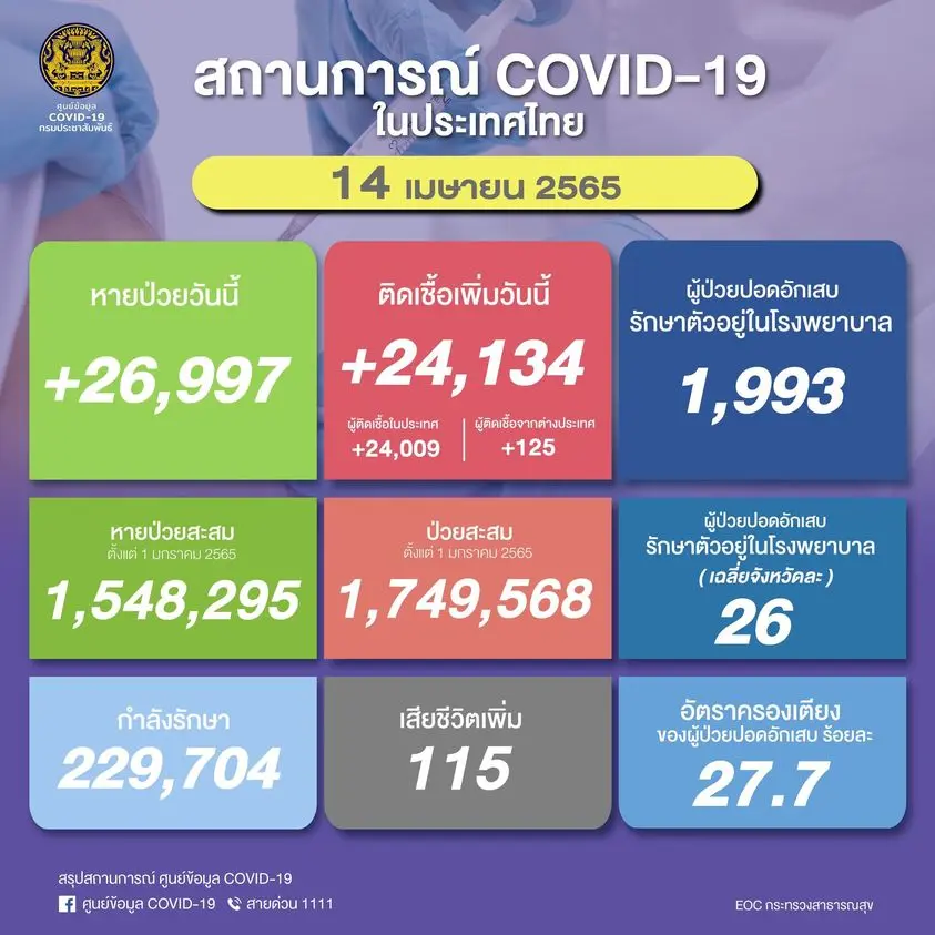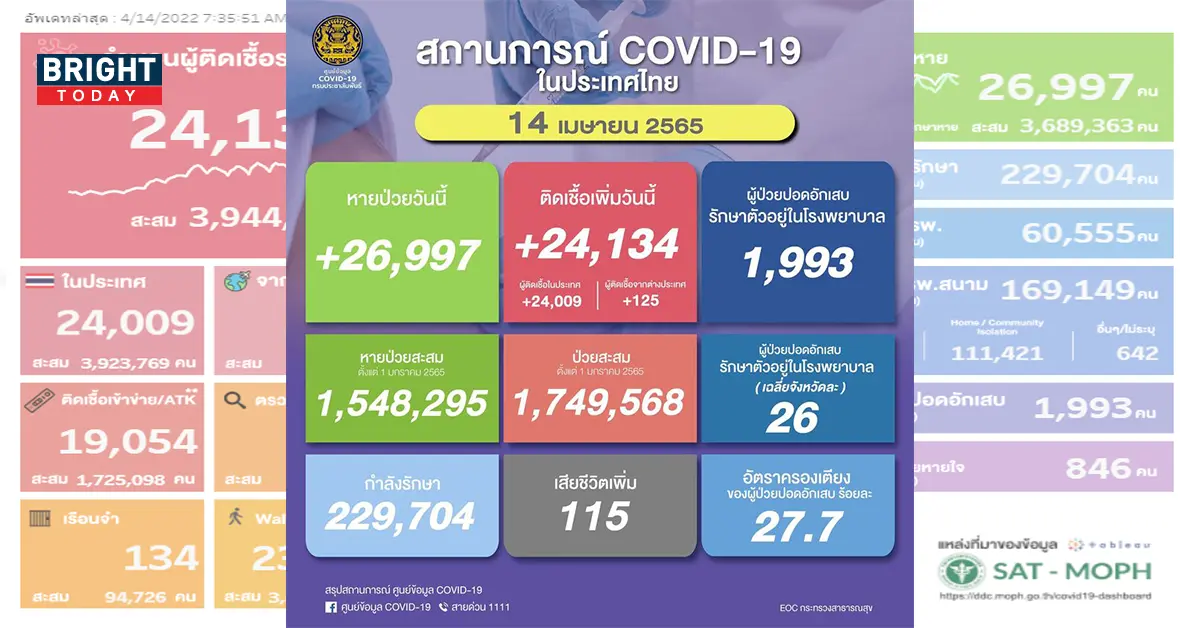 หยุดไม่อยู่! โควิดวันนี้ 14/4/65 เสียชีวิต 115 ราย ติดเชื้อรายใหม่ 24,134 ราย ไม่นับรวมATKอีก 19,054 ราย ผู้ป่วยปอดอีกเสบเกือบสองพันราย
