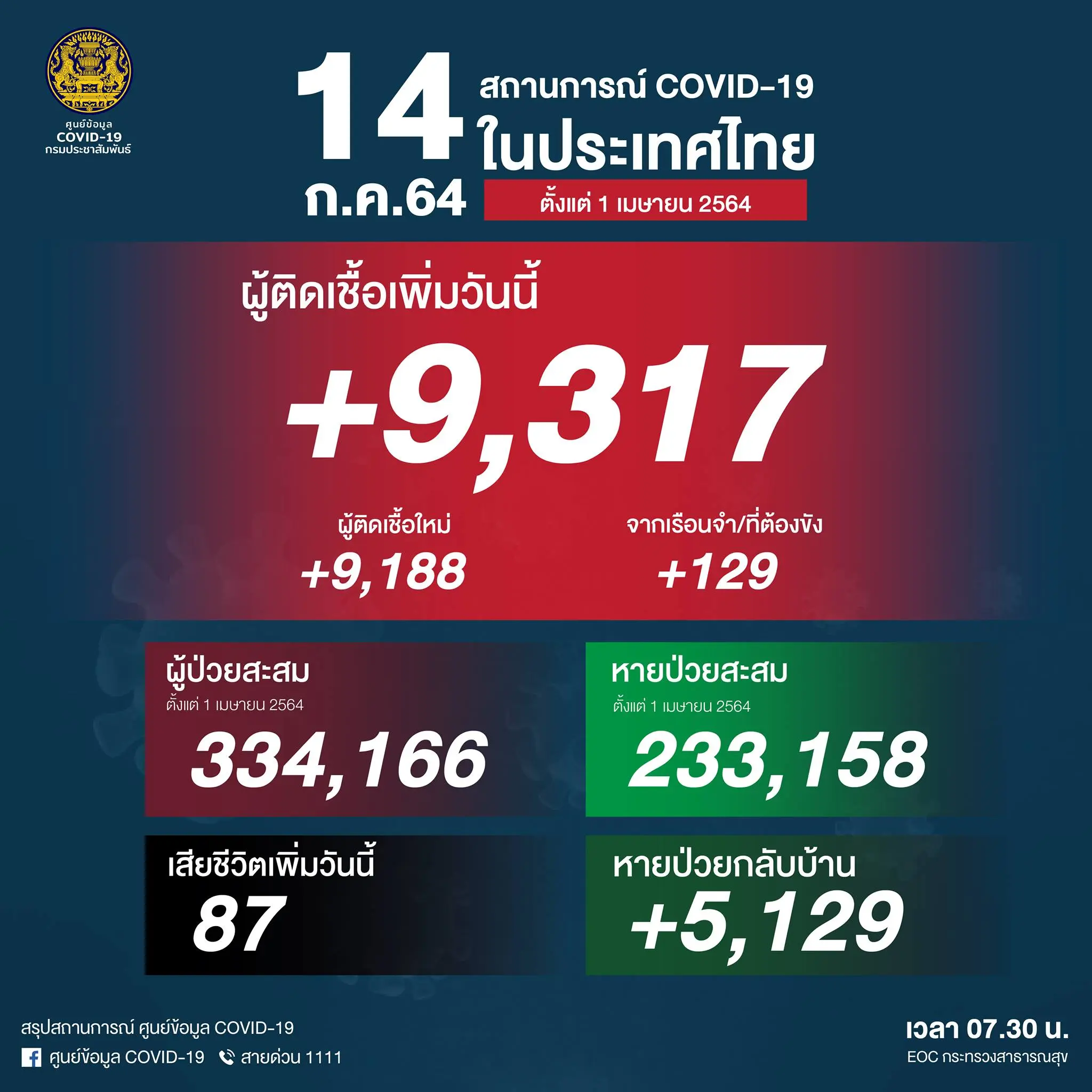 โควิดวันนี้ – รายงานสถานการณ์การแพร่ระบาดของเชื้อโควิด-19 วันที่ 14 กรกฎาคม 2564 พบผู้ติดเชื้อรายใหม่พุ่งสูงถึง 9,317 ราย โดยจำแนกเป็ยติดเชื้อรายใหม่ 9,188 ราย และ ผู้ติดเชื้อในเรือนจำ จำนวน 129 ราย หากรวมผู้ติดเชื้อสะสม โดยเริ่มนับตั้งแต่ช่วงเดือนเมษายนที่ผ่านมา เป็นจำนวน 334,166 ราย และในวันนี้ พบผู้เสียชีวิตจำนวน 87 ราย