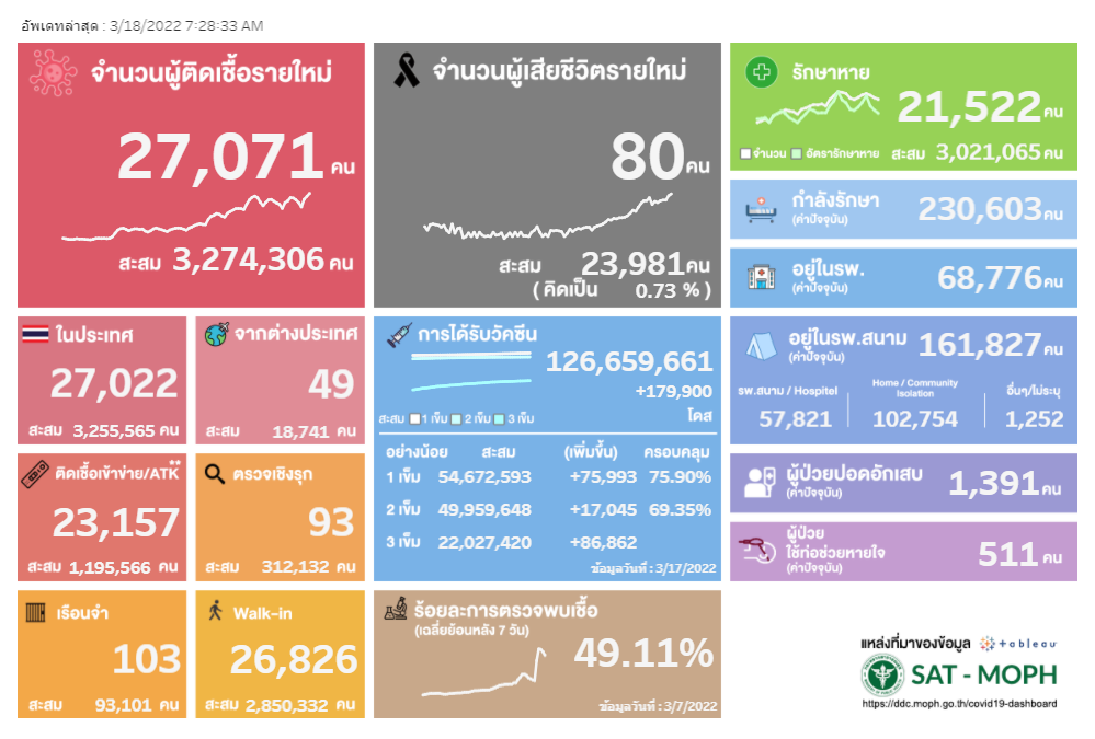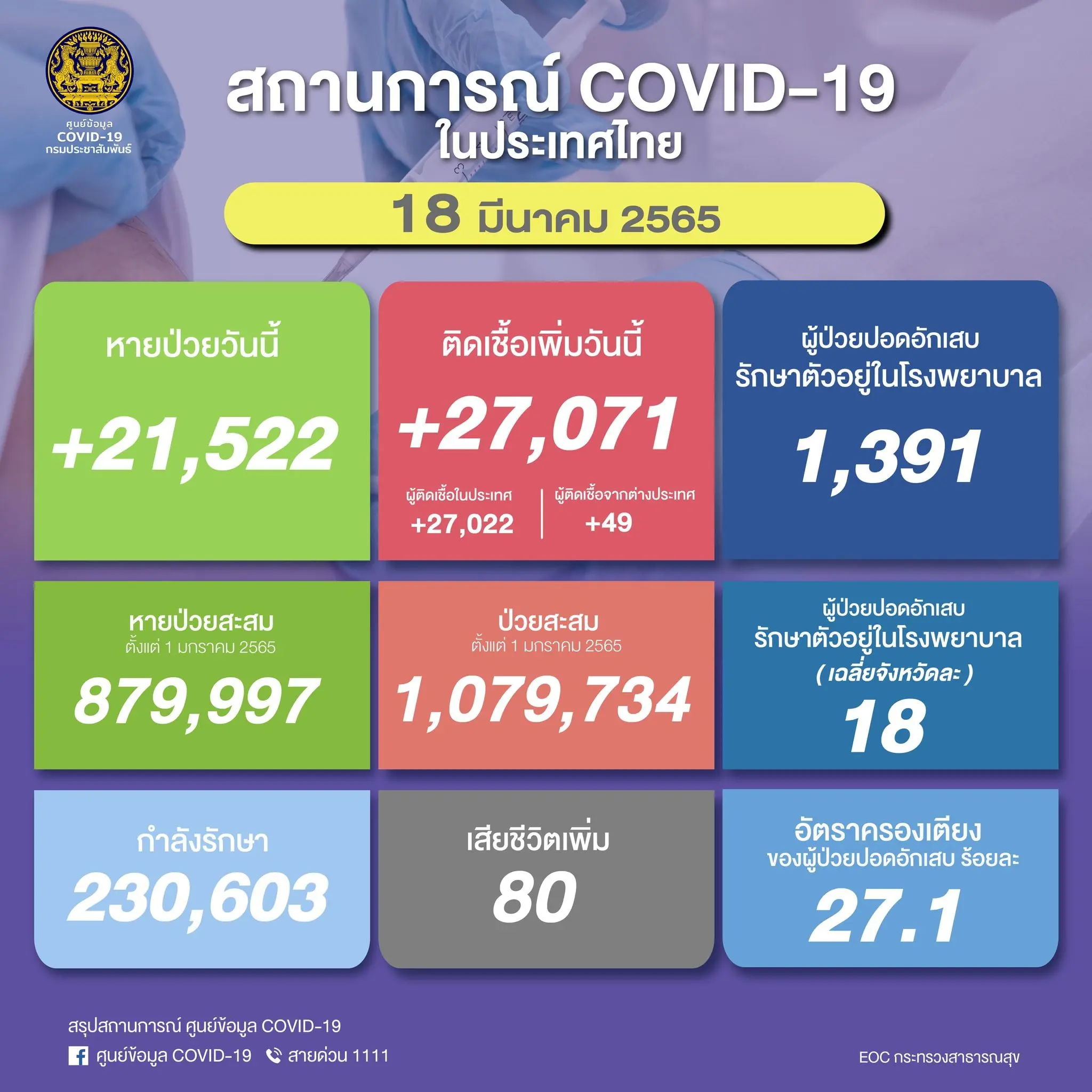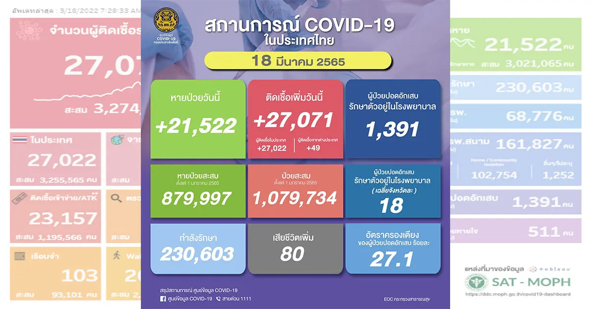 ยอดพุ่งอีกแล้ว! โควิดวันนี้ 18/3/65 ติดเชื้อรายใหม่ 27,071 ไม่รวมATKอีก 23,157 ราย ผู้ป่วยหนักเพิ่มจำนวน ยอดตายไม่ลด 80 ราย