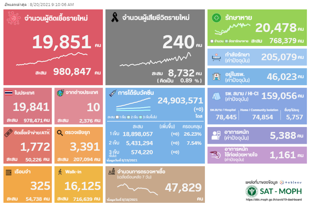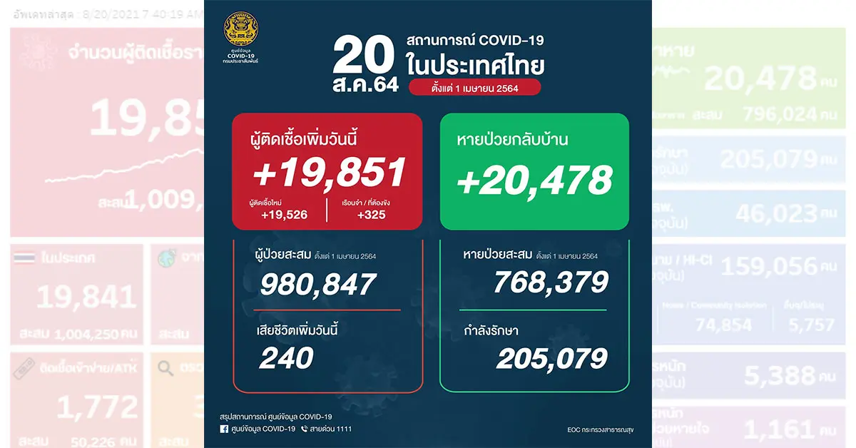 โควิดวันนี้ – รายงานสถานการณ์การแพร่ระบาดของเชื้อโควิด-19 ในวันที่ 20 สิงหาคม 2564 โดยข้อมูลจากเพจเฟซบุ๊ก ศูนย์ข้อมูล COVID-19 และเว็บไซต์ www.ddc.moph.go.th วันนี้พบผู้ติดเชื้อรายใหม่ 19,851 ราย ซึ่งแบ่งออกเป็นสองกลุ่มคือ ผู้ติดเชื้อรายใหม่ 19,526 ราย และผู้ติดเชื้อในเรือนจำ 325 ราย หากนับรวมยอดผู้ติดเชื้อตั้งแต่ช่วงเดือนเมษายนที่ผ่านมานั้น จำนวนผู้ป่วยสะสม 980,847 ราย ในส่วนของผู้เสียชีวิตวันนี้ 240 ราย หากนับรวมยอดผู้เสียชีวิตตั้งแต่ช่วงเดือนเมษายนที่ผ่านมานั้น เป็นจำนวน 8,826 ราย