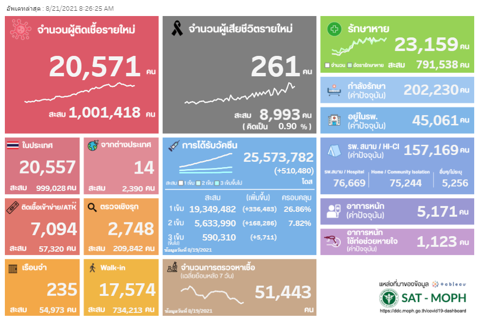 โควิดวันนี้ – รายงานสถานการณ์การแพร่ระบาดของเชื้อโควิด-19 ในวันที่ 21 สิงหาคม 2564 โดยข้อมูลจากเพจเฟซบุ๊ก ศูนย์ข้อมูล COVID-19 และเว็บไซต์ www.ddc.moph.go.th วันนี้พบผู้ติดเชื้อรายใหม่ 20,571 ราย ซึ่งแบ่งออกเป็นสองกลุ่มคือ ผู้ติดเชื้อรายใหม่ 20,336 ราย และผู้ติดเชื้อในเรือนจำ 235 ราย หากนับรวมยอดผู้ติดเชื้อตั้งแต่ช่วงเดือนเมษายนที่ผ่านมานั้น จำนวนผู้ป่วยสะสม 1,001,418 ราย ในส่วนของผู้เสียชีวิตวันนี้ 261 ราย หากนับรวมยอดผู้เสียชีวิตตั้งแต่ช่วงเดือนเมษายนที่ผ่านมานั้น เป็นจำนวน 8,993 ราย