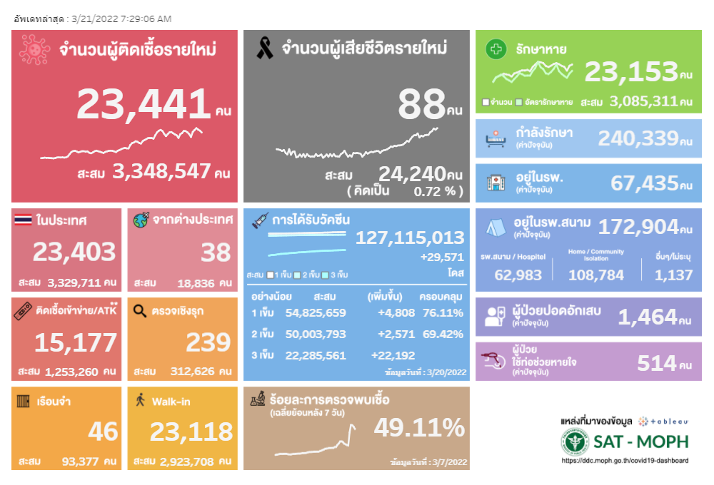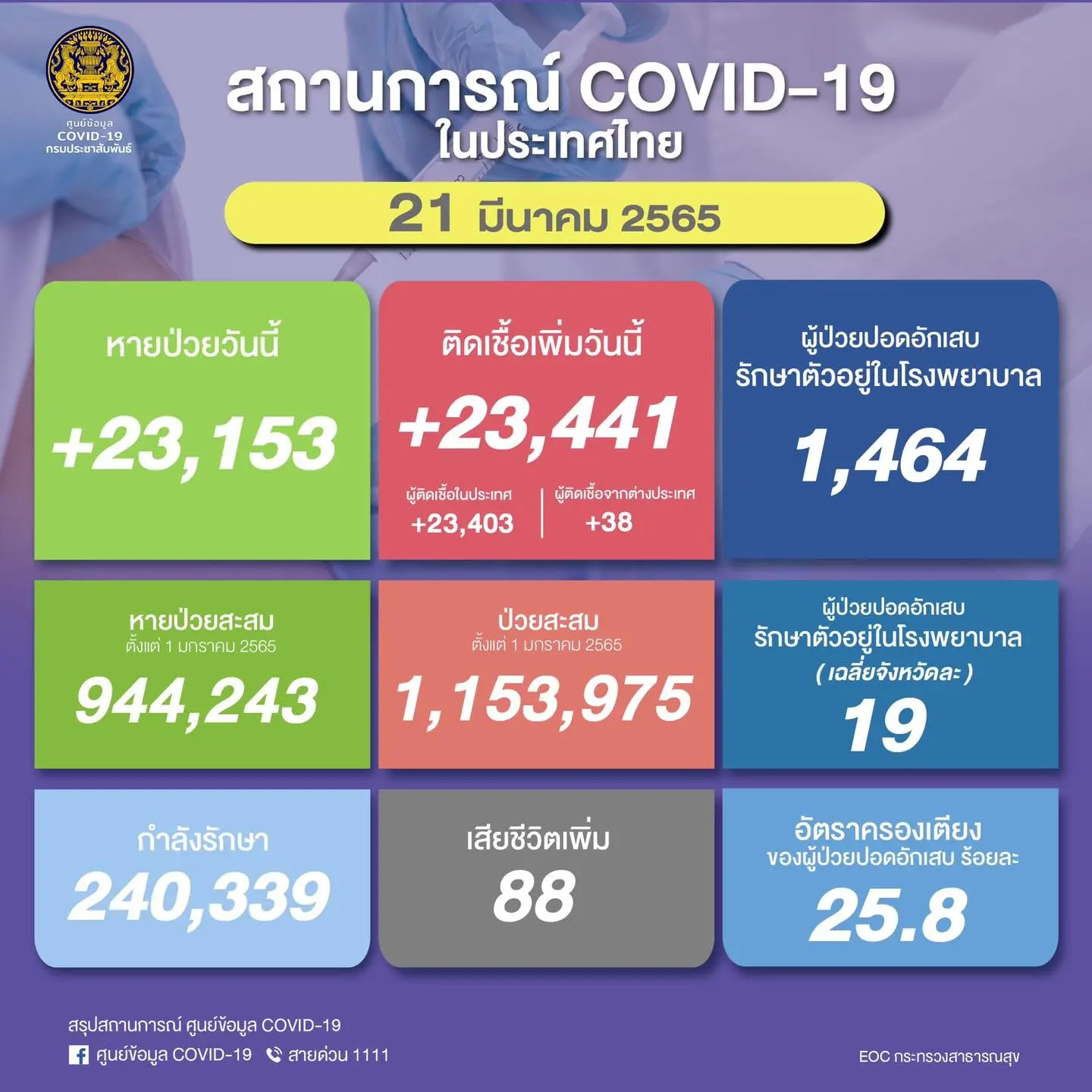 สถิติใหม่! โควิดวันนี้ 21 มีนาคม 2565 เสียชีวิต 88 ราย ติดเชื้อรายใหม่ 23,441 ราย ไม่รวมATKอีกหมื่นกว่าราย ผู้ป่วยหนักยังสูงอยู่