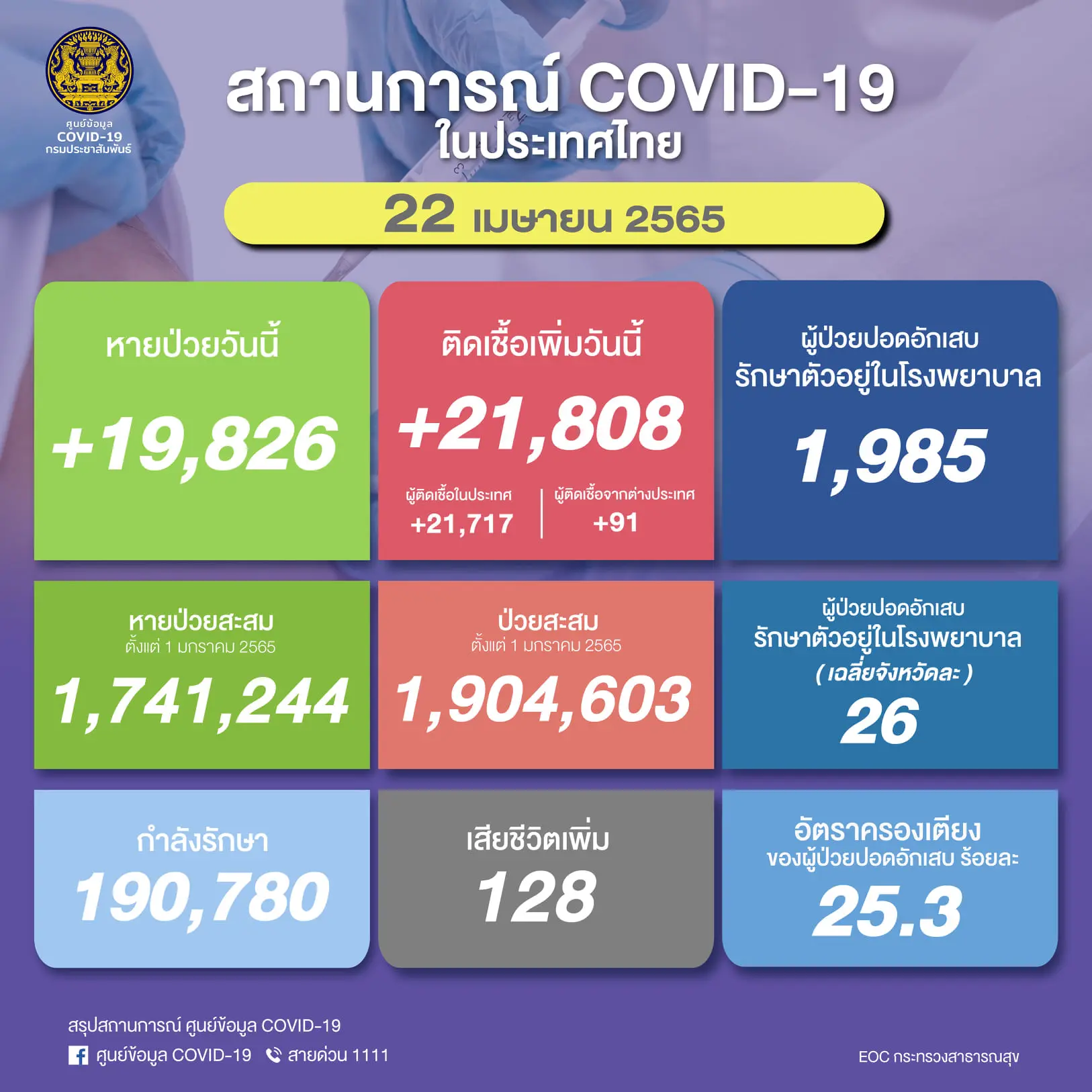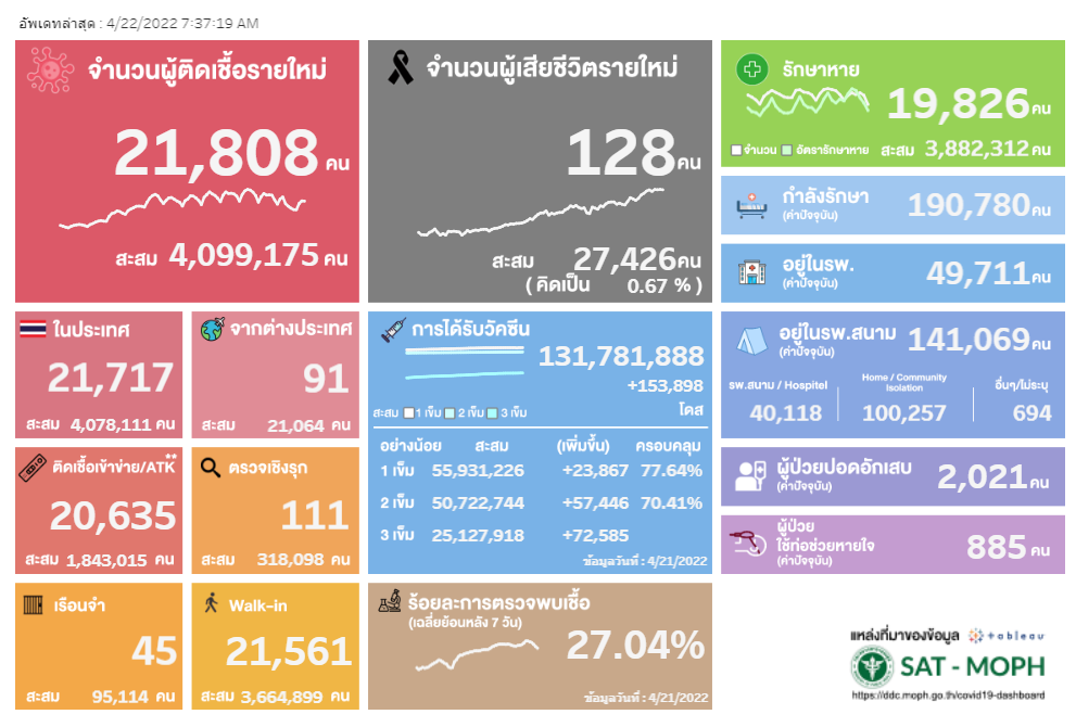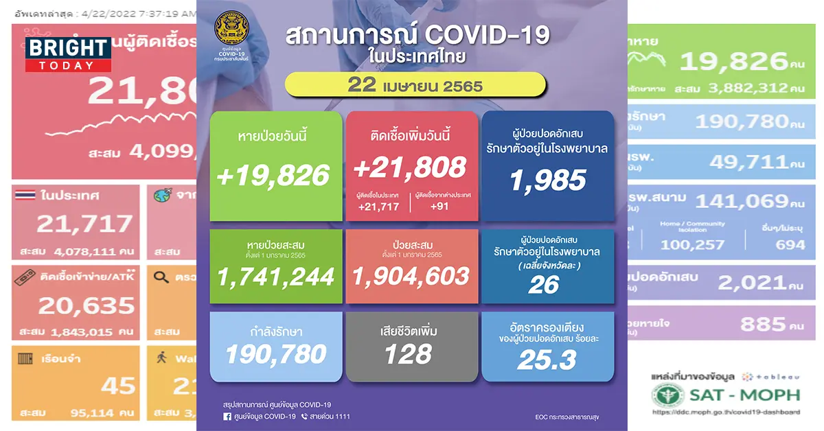 เพิ่มขึ้นทุกวัน! โควิดวันนี้ 22/4/65 เสียชีวิต 128 ราย ติดเชื้อรายใหม่ 21,808 ราย ไม่นับรวมATK อีก 20,635 ราย home isolate กว่าแสนราย