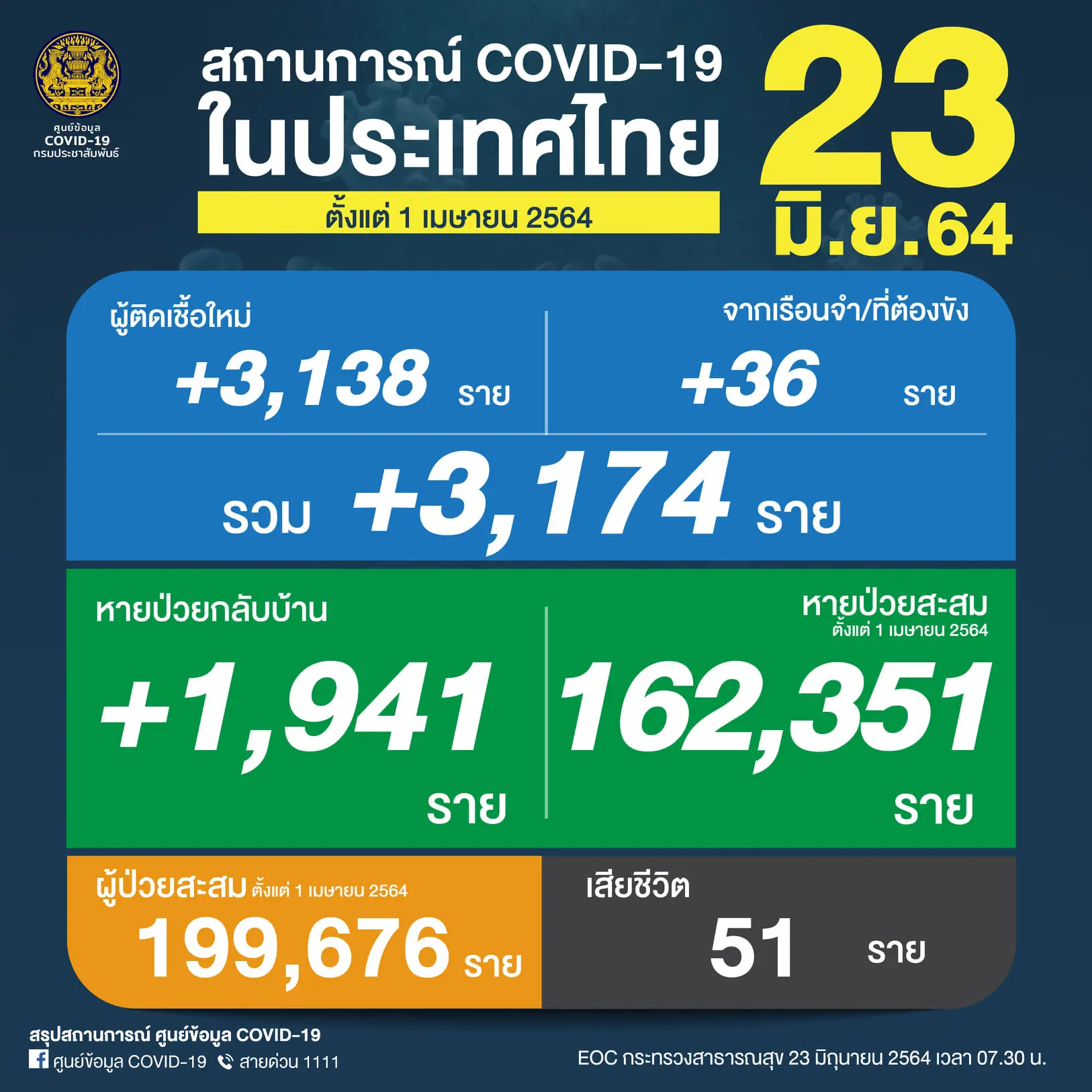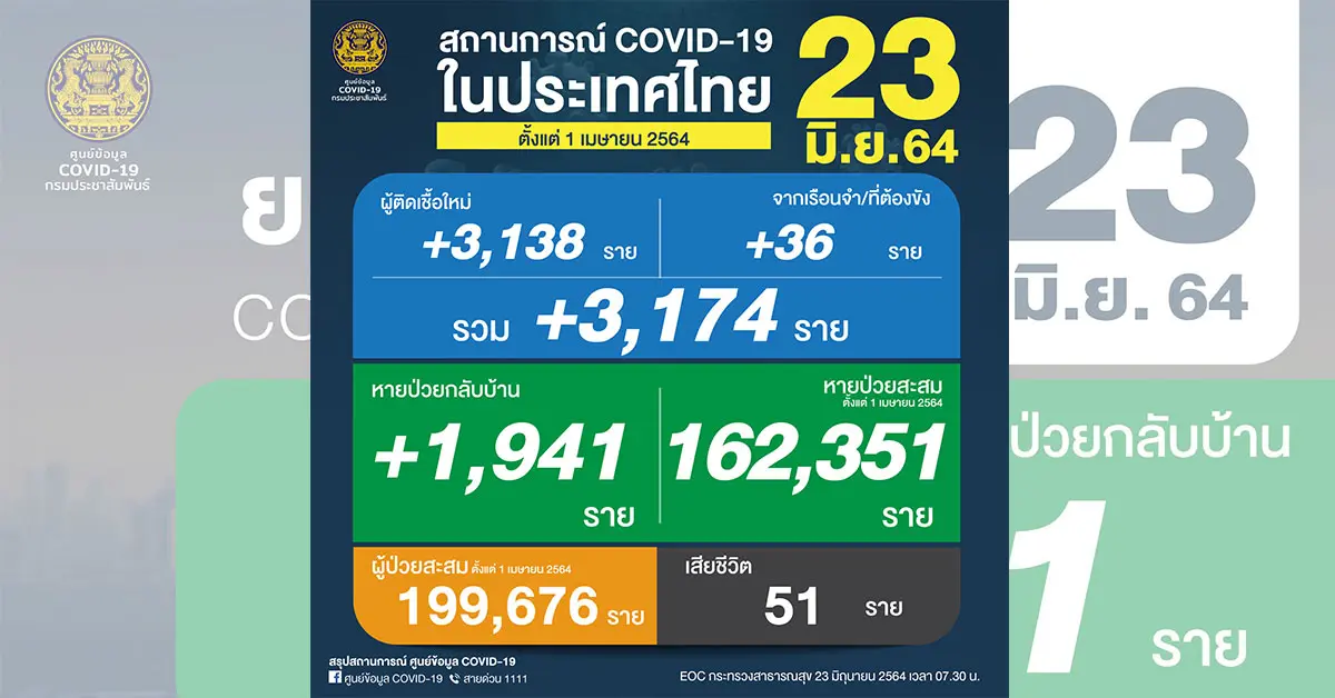 รายงานข้อมูลสถานการณ์การแพร่ระบาดของเชื้อโควิด-19 ของวันที่ 23 มิถุนายน 2564 โดย ศูนย์ข้อมูล COVID-19 โดยพบผู้ติดเชื้อรายใหม่เพิ่ม 3,174 ราย แบ่งเป็นผู้ติดเชื้อรายใหม่ด้านนอก 3,138 ราย และผู้ติดเชื้อรายใหม่ ในเรือนจำ 36 ราย ทำให้ผู้ป่วยสะสมนับตั้งแต่ระลอกใหม่ตั้งแต่เดือนเมษายน 2564 จำนวน 199,676 รายโดยวันนี้ผู้เสียชีวิตพุ่งสูงถึง 51 ราย