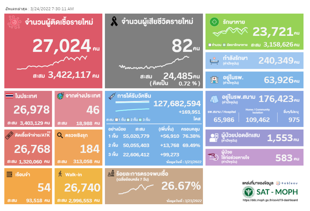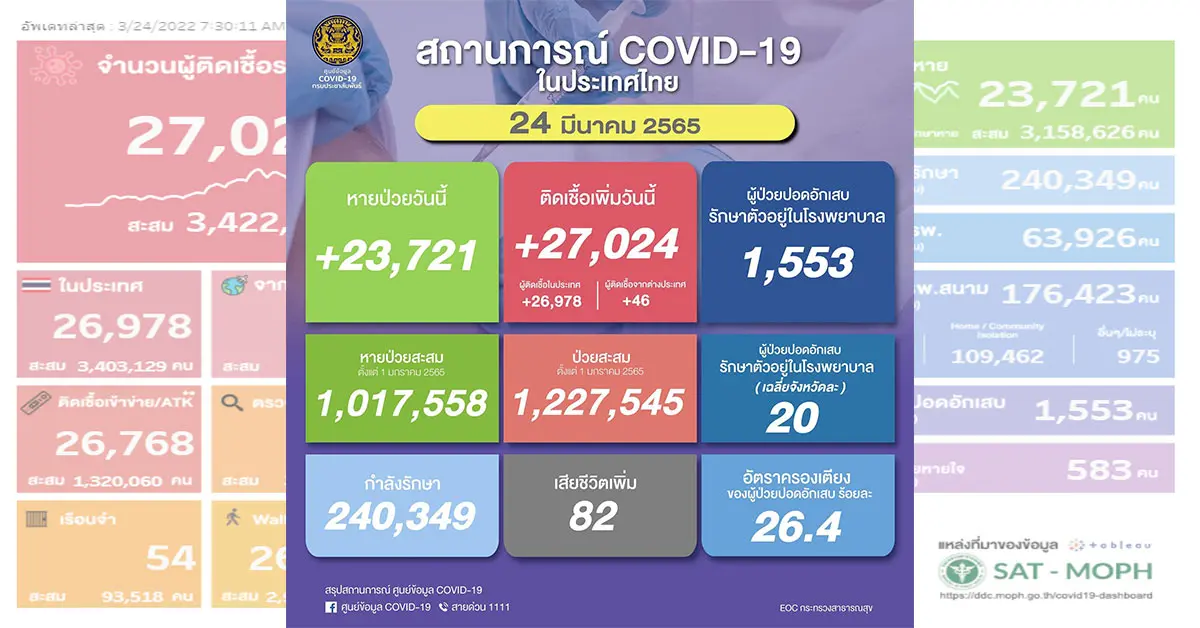 โควิดวันนี้ ไม่แผ่ว!! 24/3/65 ติดเชื้อรายใหม่ 27,024 รายไม่รวมATK อีก 26,768 ราย สูญเสียอีก 82 ชีวิต ผู้ป่วยหนักเพิ่มจำนวนต่อเนื่อง