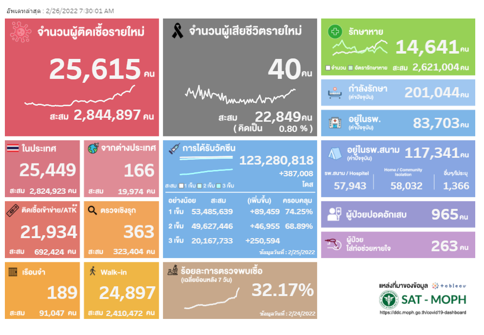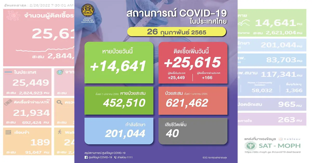 โควิดวันนี้ – รายงานสถานการณ์การแพร่ระบาดของเชื้อโควิด-19 ในวันที่ 26 กุมภาพันธ์ 2565 โดยข้อมูลจากเพจเฟซบุ๊ก ศูนย์ข้อมูล COVID-19 และเว็บไซต์ www.ddc.moph.go.th วันนี้พบผู้ติดเชื้อรายใหม่ 25,615 ราย หากนับรวมยอดผู้ติดเชื้อตั้งแต่ช่วงวันที่ 1 มกราคม 2565 จำนวนผู้ป่วยสะสม 621,412 ราย ในส่วนของผู้เสียชีวิตวันนี้ 40 ราย หากนับรวมยอดผู้เสียชีวิตตั้งแต่ช่วงเดือนเมษายน 2564 ที่ผ่านมานั้น เป็นจำนวน 22,849 ราย