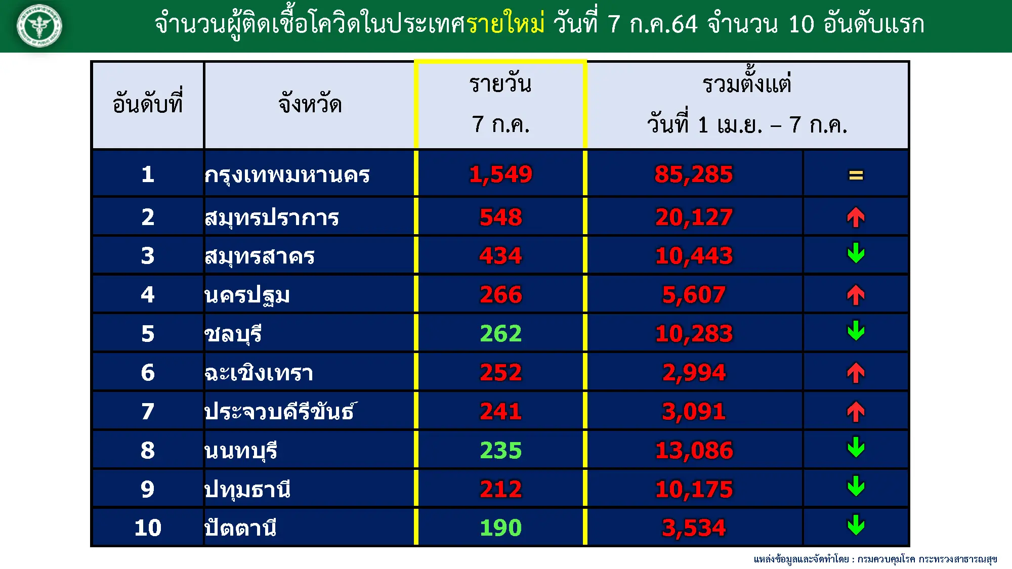 - กทม.ยังคงเป็นพื้นที่ที่พบผู้ติดเชื้อรายวันมากที่สุดในประเทศ ซึ่งวันนี้พบผู้ติดเชื้อรายใหม่กว่า 1,549 ราย และยังเป็นจังหวัดที่พบผู้เสียชีวิตถึง 30 ราย