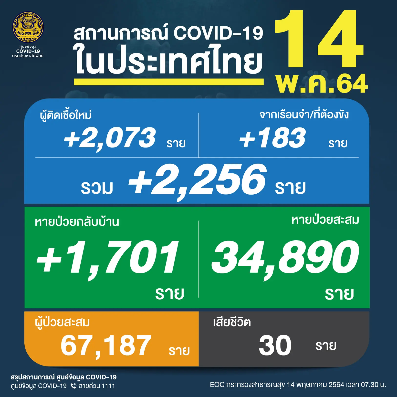 โควิดวันนี้ — เมื่อวันที่ 14 พ.ค. 64 ศูนย์ข้อมูล COVID-19 รายงานยอดผู้ติดเชื้อ โควิด-19 โดยพบผู้ติดเชื้อรายใหม่เพิ่ม 2,256 ราย เสียชีวิต 30 ราย ติดเชื้อจากเรือนจำ 183 ราย ทำให้การระบาดโควิด19 ระลอกใหม่ตั้งแต่เดือนเมษายน 2564 มียอดผู้เสียชีวิตสะสม 454 ราย ส่วนยอดผู้เสียชีวิตสะสมจากการแพร่ระบาดของโควิด19 ในเวลามีทั้งหมด 548 ราย