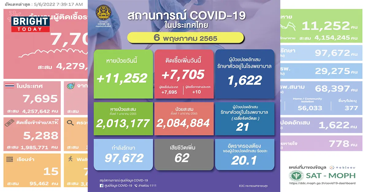 ยอดลดลงต่อเนื่อง โควิดวันนี้ 6/5/65 ติดเชื้อรายใหม่ 7,705 ราย ไม่นับรวมATK อีกจำนวน 5,288 ราย เสียชีวิตเพิ่ม 62 ราย