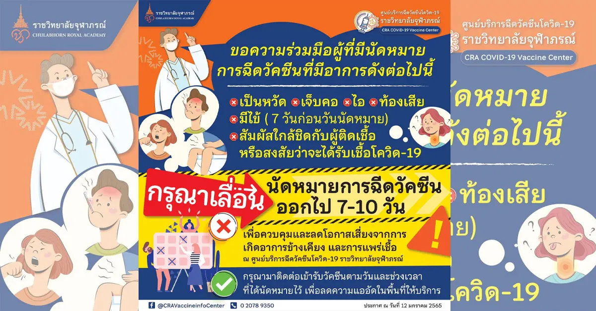 กรุณาเลื่อนนัดหมายการฉีดวัคซีนของท่านออกไป 7-10 วัน เพื่อควบคุมและลดโอกาสเสี่ยงจากการเกิดอาการข้างเคียง และการแพร่เชื้อ ณ ศูนย์บริการฉีดวัคซีนโควิด-19 ราชวิทยาลัยจุฬาภรณ์