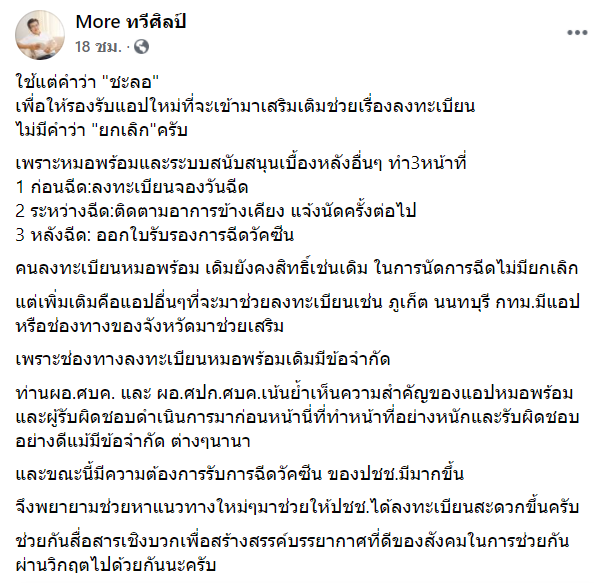 ใช้แต่คำว่า “ชะลอ” เพื่อให้รองรับแอปใหม่ที่จะเข้ามาเสริมเติมช่วยเรื่องลงทะเบียนไม่มีคำว่า “ยกเลิก” ครับ เพราะหมอพร้อมและระบบสนับสนุนเบื้องหลังอื่นๆ ทำ 3 หน้าที่