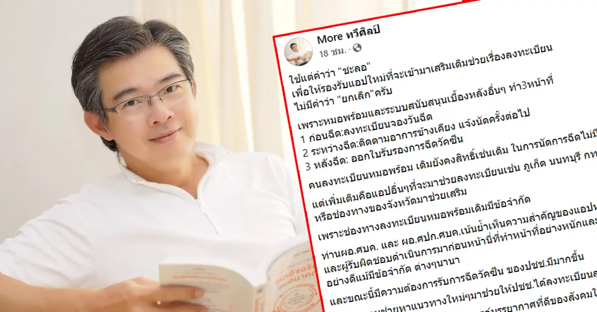 ตามที่สื่อมวลชนหลายสำนัก ได้นำเสนอข่าวเรื่อง พล.อ.ประยุทธ์ จันทร์โอชา นายกรัฐมนตรี สั่งเบรกการลงทะเบียนทาง “หมอพร้อม” นั้น ล่าสุดเมื่อวันที่ 26 พฤษภาคมที่ผ่านมา นพ.ทวีศิลป์ วิษณุโยธิน โฆษกศบค. ได้โพสต์ข้อความผ่านทางเฟซบุ๊ก More ทวีศิลป์ โดยระบุว่า