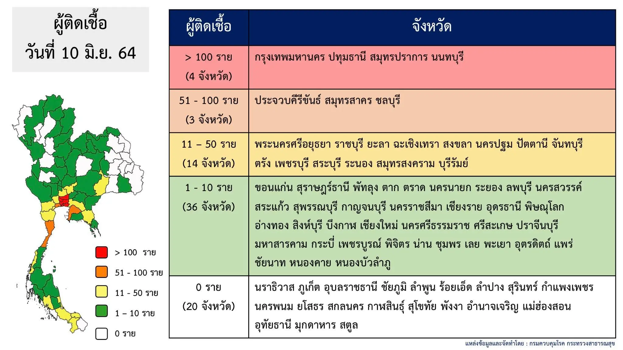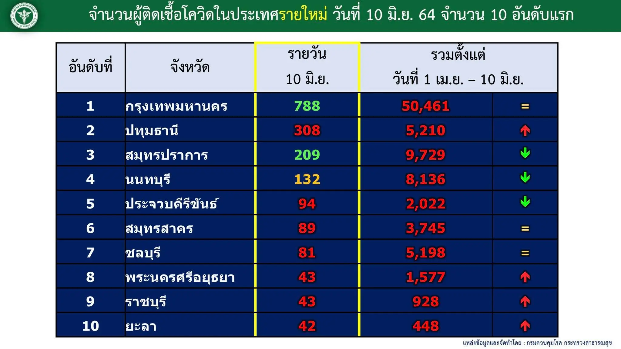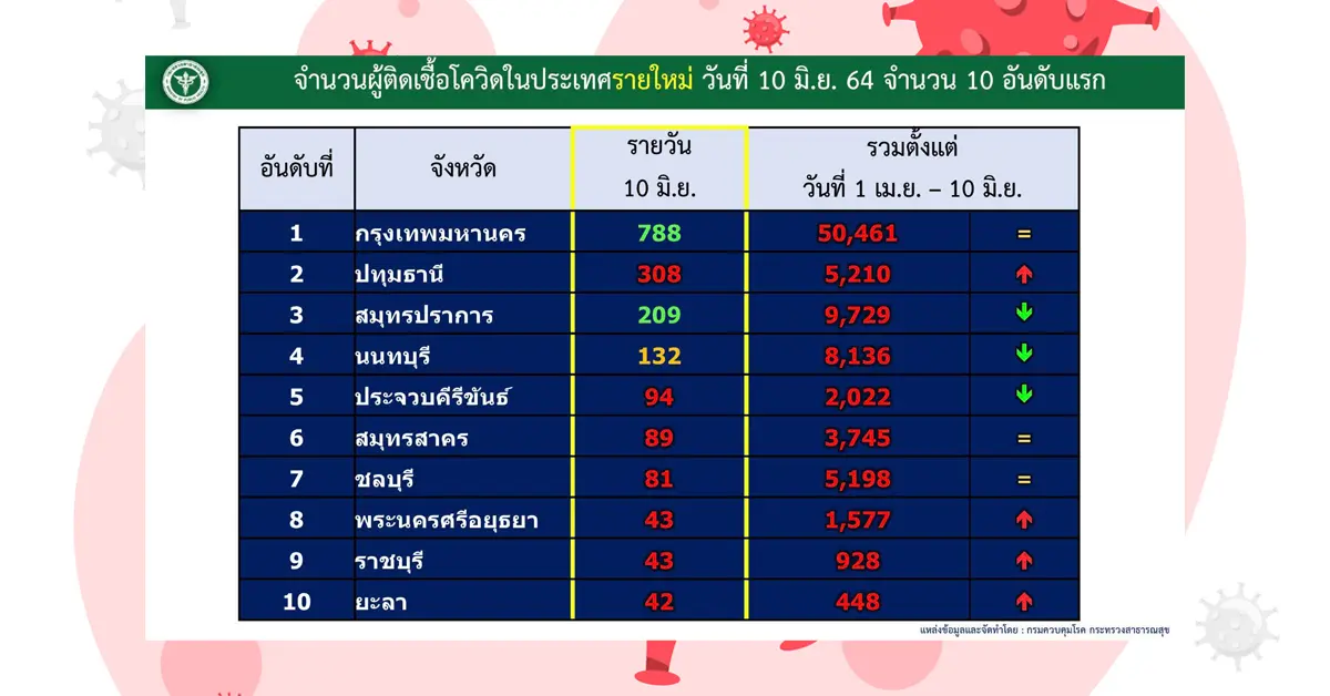 อัพเดท 10 จังหวัด ยอดติดเชื้อโควิด19 สูงสุด ประจำวันที่ 10 มิ.ย. 64 อันดับ 1 กทม. 788 ราย รองลงมาคือปทุมธานีขึ้นมา 308 ราย