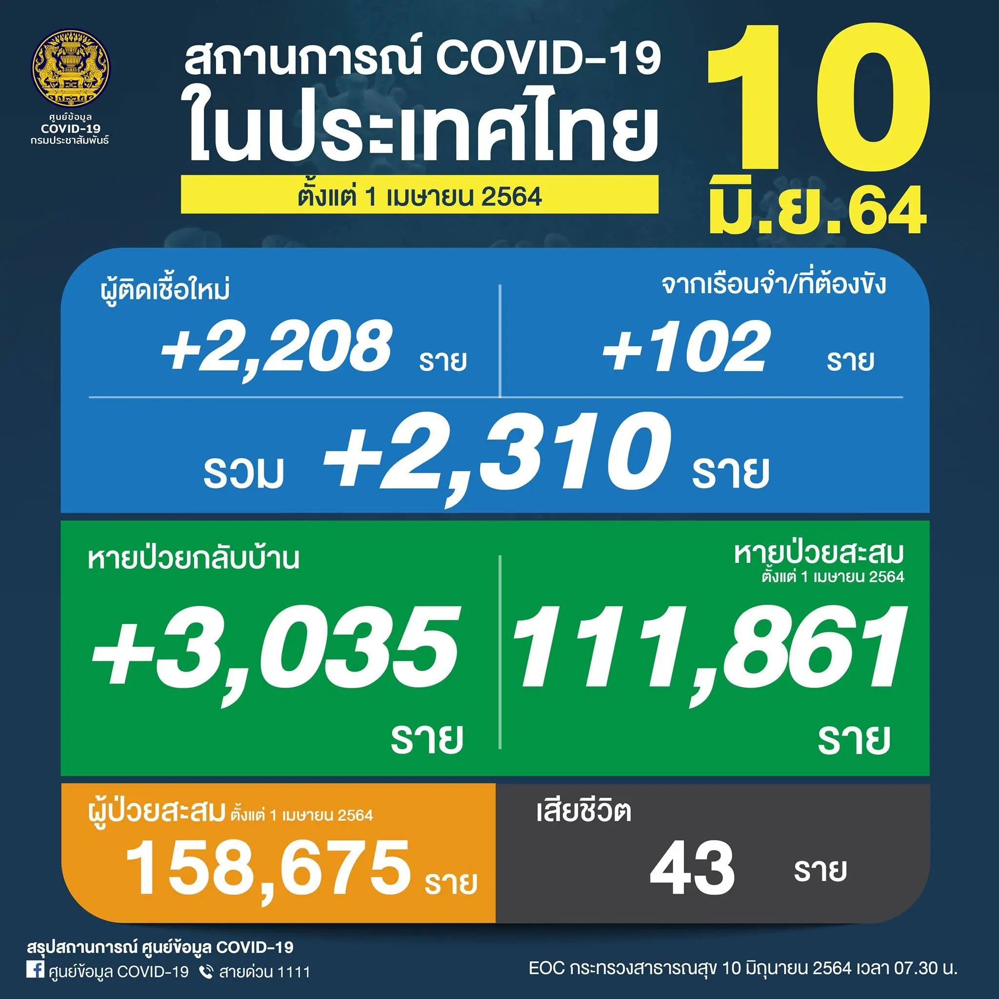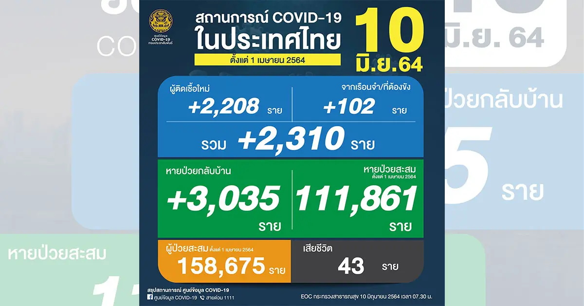โควิดวันนี้ 10 มิถุนายน 2564 พบผู้ติดเชื้อรายใหม่ 2,310 ราย เป็นยอดรวมกับผู้ติดเชื้อในเรือนจำ และยอดผู้เสียชีวิตพุ่งถึง 43 รายในวันนี้