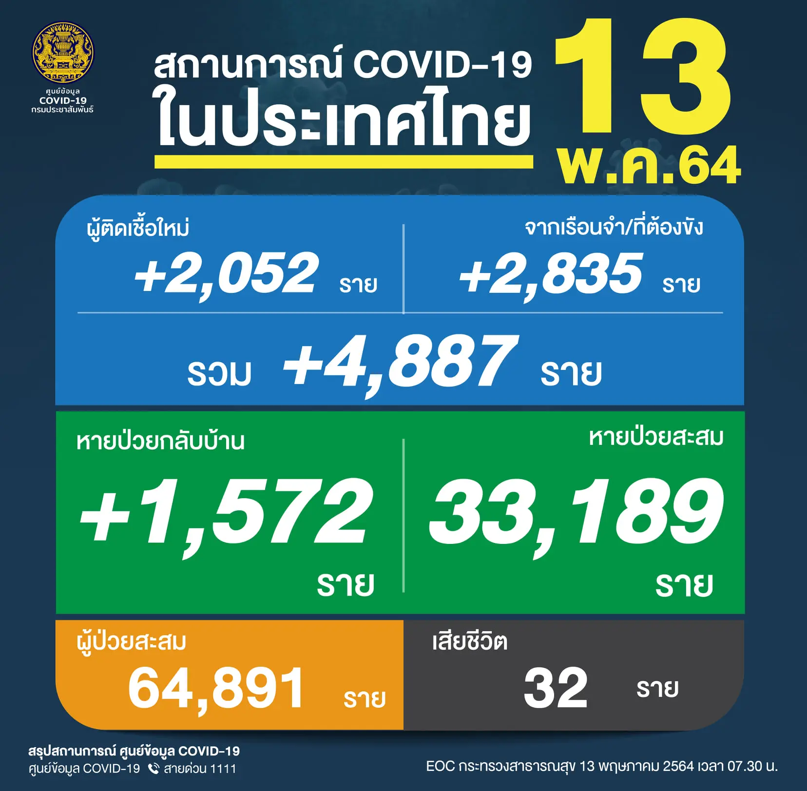 โควิดวันนี้ — เมื่อวันที่ 13 พ.ค. 64 ศูนย์ข้อมูล COVID-19 รายงานยอดผู้ติดเชื้อ โควิด-19 โดยพบผู้ติดเชื้อรายใหม่เพิ่ม 2,052 ราย เสียชีวิต 32 ราย ซึ่งทำให้การระบาดโควิด19 ระลอกใหม่ตั้งแต่เดือนเมษายน 2564 มียอดผู้เสียชีวิตสะสม 424 ราย ส่วนยอดผู้เสียชีวิตสะสมจากการแพร่ระบาดของโควิด19 ในเวลามีทั้งหมด 518 ราย